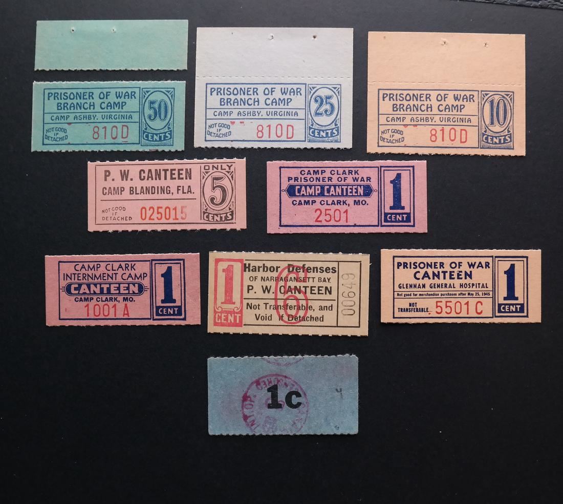Includes prisoner of war and internment camp canteen coupons or chits from Camp Maxey (Texas), Davis-Monthan (Arizona), Florence (Arizona), Fort Ord (California), Huntsville (Texas), Mexia (Texas), Papago Park (Arizona), Ruston (Louisiana), Como (Mississippi), Crossville (Tennessee), Mexia (Texas), Roswell (New Mexico), Camp Ashby (Virginia), Camp Blanding (Florida), Camp Clark (Missouri), and elsewhere, generally sound and VF-XF. (Lyn Knight Memphis auction of 13-15 June 2002 and St. Louis auction of 20-23 November 2003)