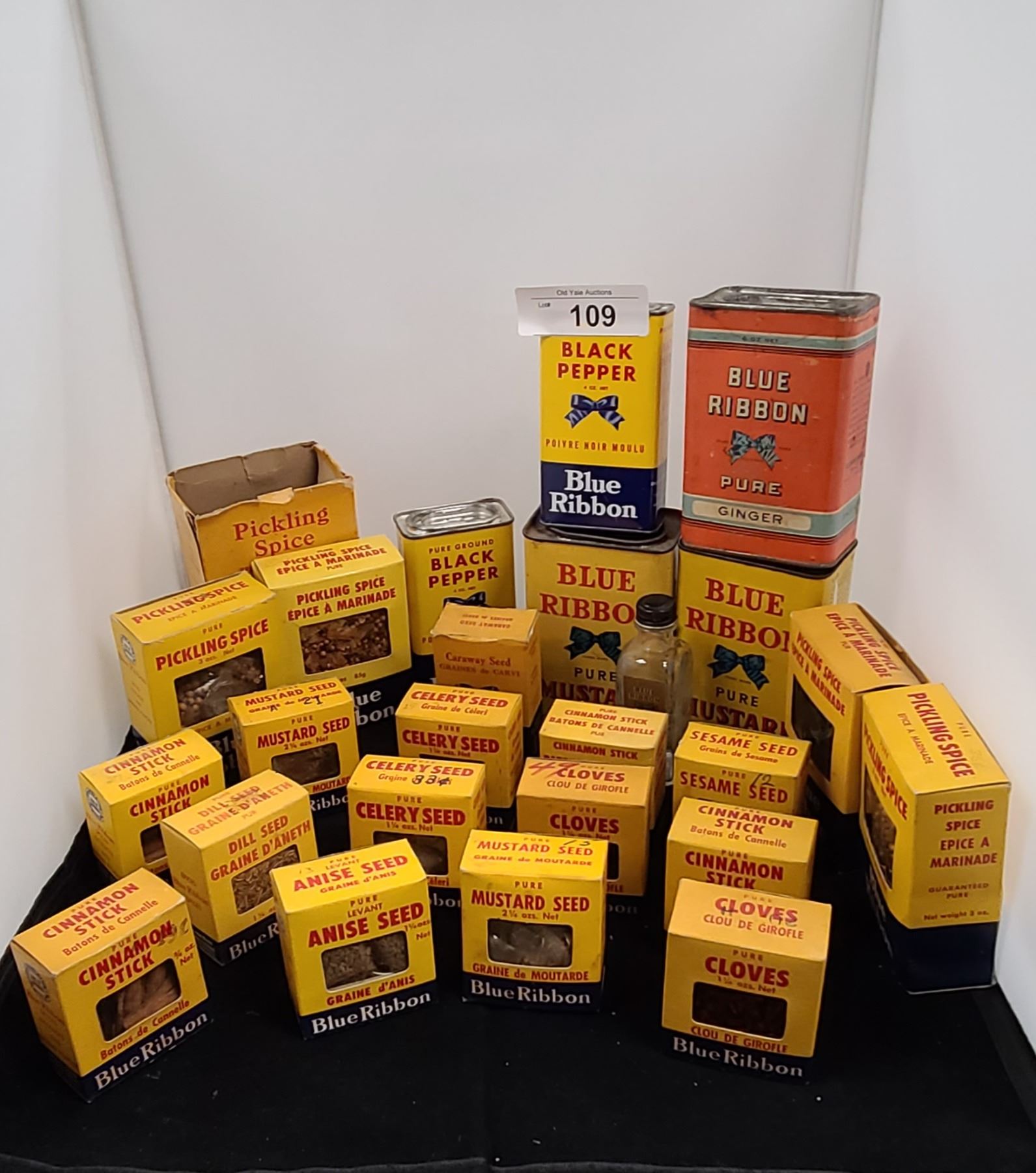 COLLECTION OF VINTAGE BLUE RIBBON, SPICE TINS AND BOXES
