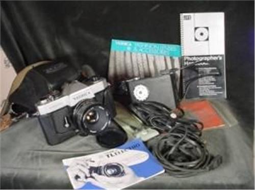 COLLECTION OF VINTAGE CAMERA EQUIPMENT INCLUDING A YASHICA TL-ELECTRO CAMERA WITH CASE, CORDS, LIGHT, STRAP, BOOKS, AND MORE.