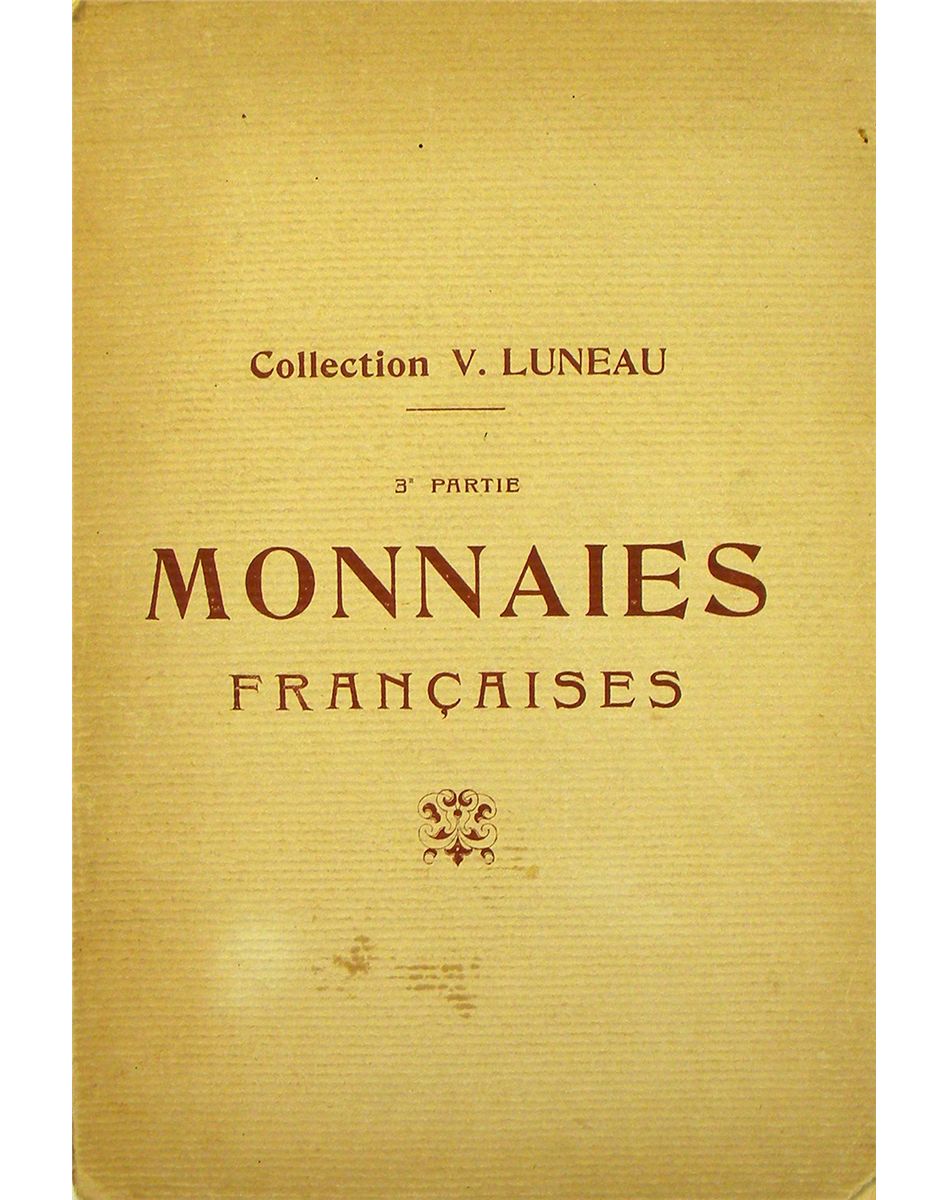 Platt, Clément. COLLECTION V. LUNEAU. 3E PARTIE: MONNAIES FRANÇAISES: GAULOISES, MÉROVINGIENNES, CAROLINGIENNES, CAPÉTIENNES ET DE LA RÉVOLUTION A NOS JOURS. Paris, 5–8 février 1923. 4to, original printed card covers. 90, (2) pages; 1151 lots; 24 very fine plates of coins. Near fine. Important and scarce. The first two parts included Luneau’s ancient coins. Clain-Stefanelli 6397.