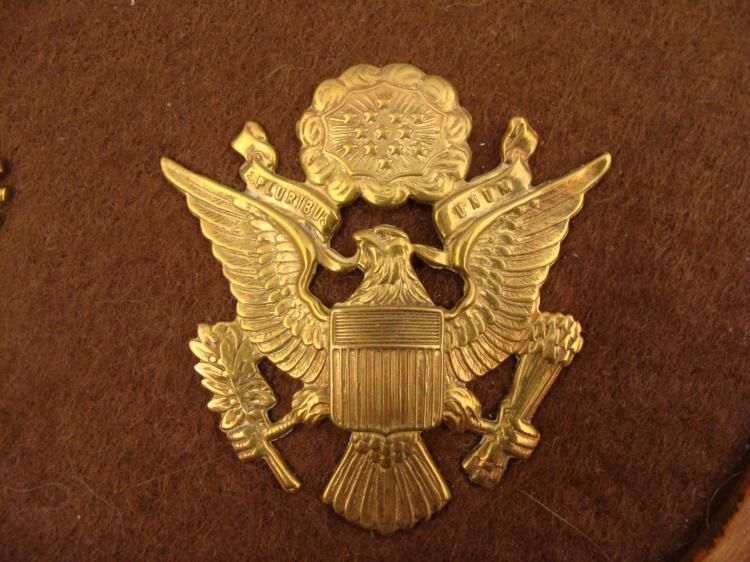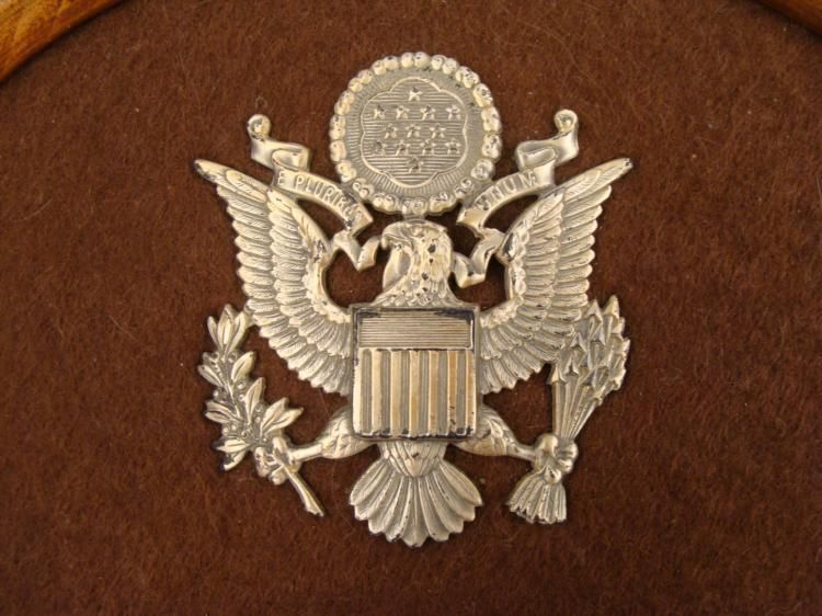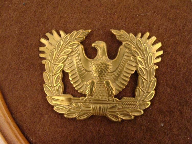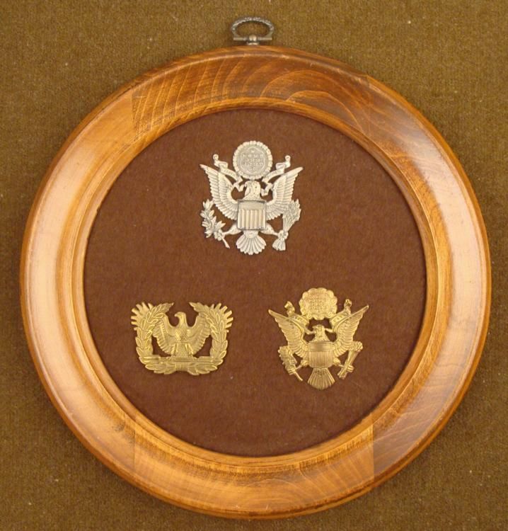 THIS IS A COLLECTOR MADE DISPLAY OF 3 U.S. MILITARY HAT DEVICES. ONE IS FROM THE SPANISH-AMERICAN WAR & TWO ARE FROM WWII IN. ALL THREE OF THEM ARE ON A BROWN CLOTH, IN A WOOD FRAME. ALL OF THE DEVICES HAVE SCREW BACKS. THIS IS A NICE, ROUND WOOD FRAME THAT IS 10" IN DIAMETER, WITH A FEW NICKS. *