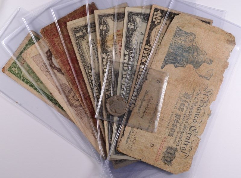 ( 4 ) FOREIGN NOTES, ( 3 ) 1935 $1.00 SILVER CERTIFICATES, 1953 $2.00 RIPPED, 1976 $2.00 UNC. 1928-B $10.00 CIRC. AND A CIRCULATED 1920-S BUFFALO NICKEL ESTIMATE, $50.00 TO $55.00