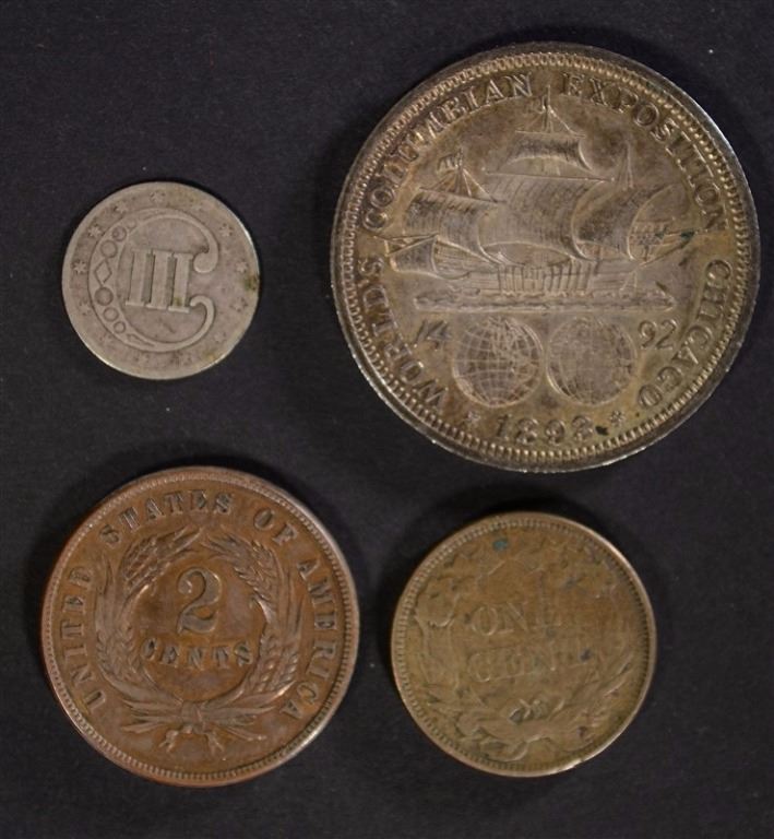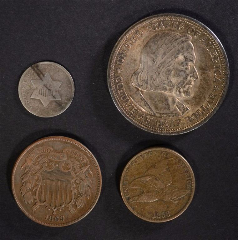 1858 FLYING EAGLE CENT, 1869 2-CENT PIECE, 1852 3-CENT PIECE & 1893 COLUMBIAN HALF DOLLAR ESTIMATE $120 - $130.