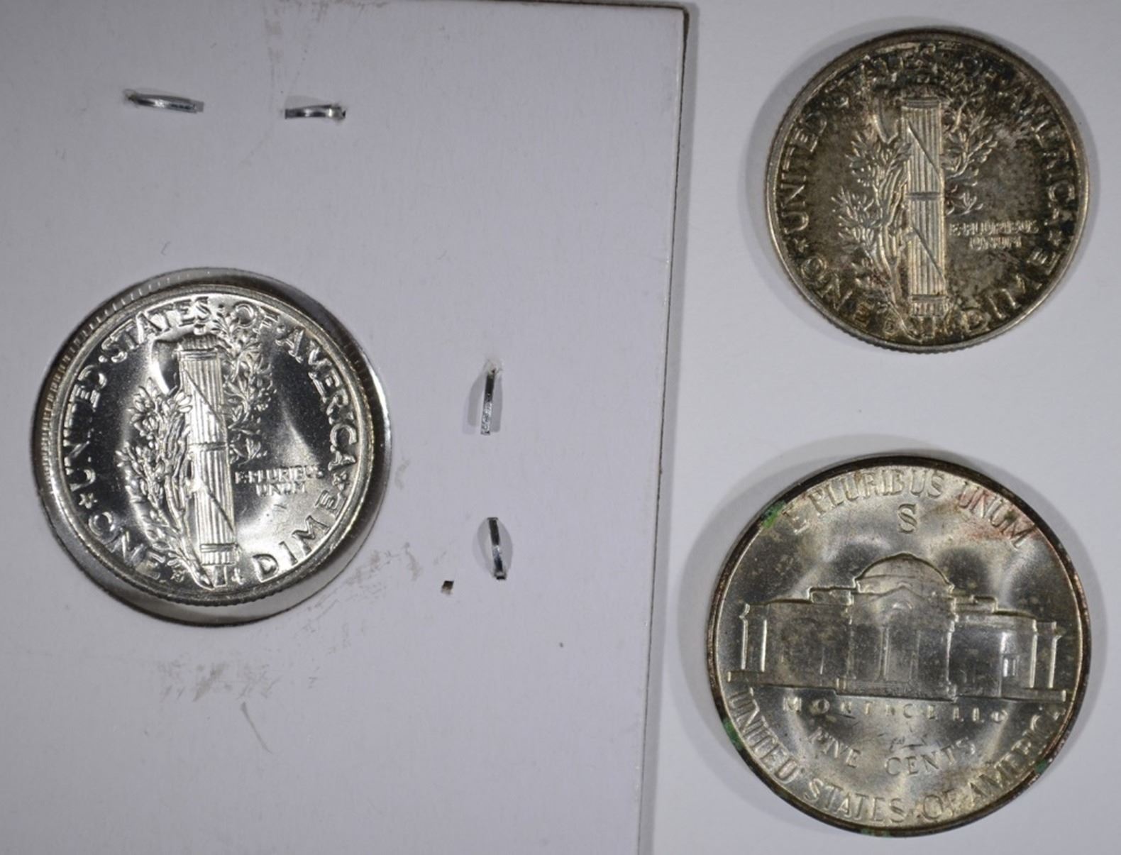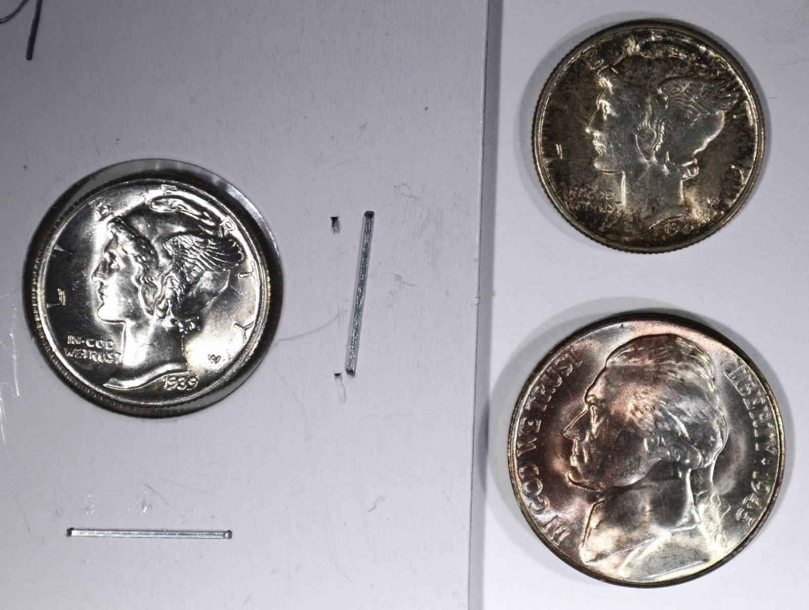 1939-S MERCURY DIME, GEM BU, 1945-D MERCURY DIME CH BU & 1945-S GEM BU NICKEL ESTIMATE $65 - $75.