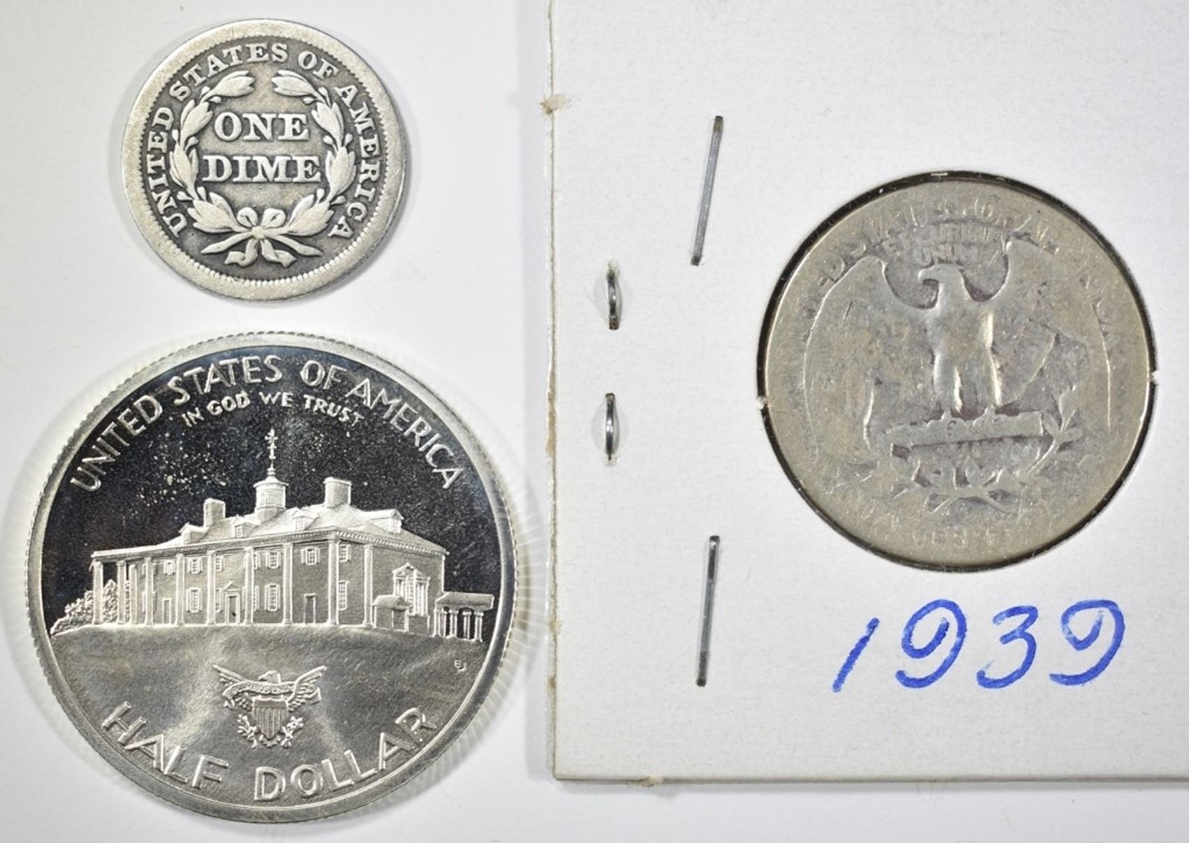 1853 ARROWS SEATED DIME, 1939 WASHINGTON QUARTER & 1982 WASHINGTON COMMEM HALF DOLLAR ESTIMATE $60 - $75.