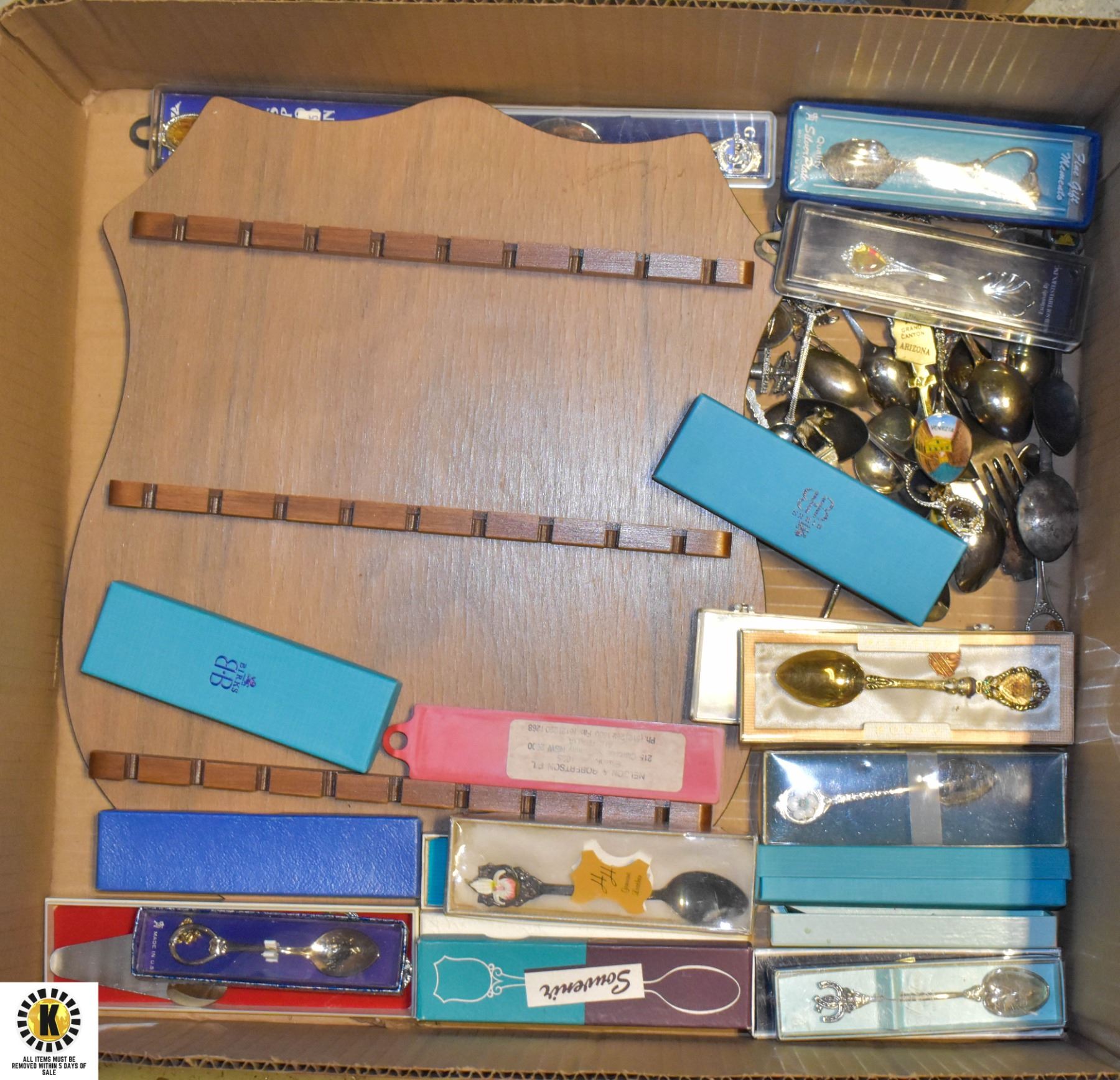 COLLECTOR SPOONS- ASSORTED LOT W/ WOOD WALL RACK