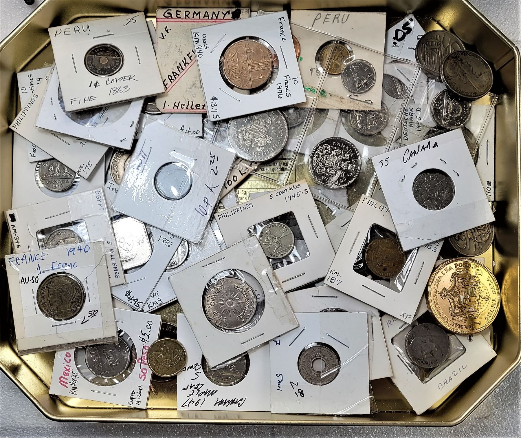 COLLECTOR TIN CONTAINING 43 ASSORTED WORLD COINS