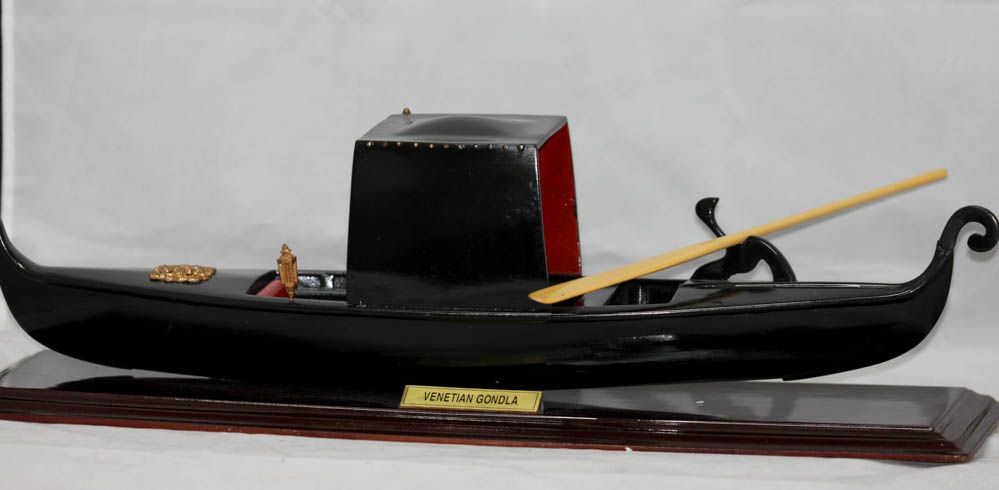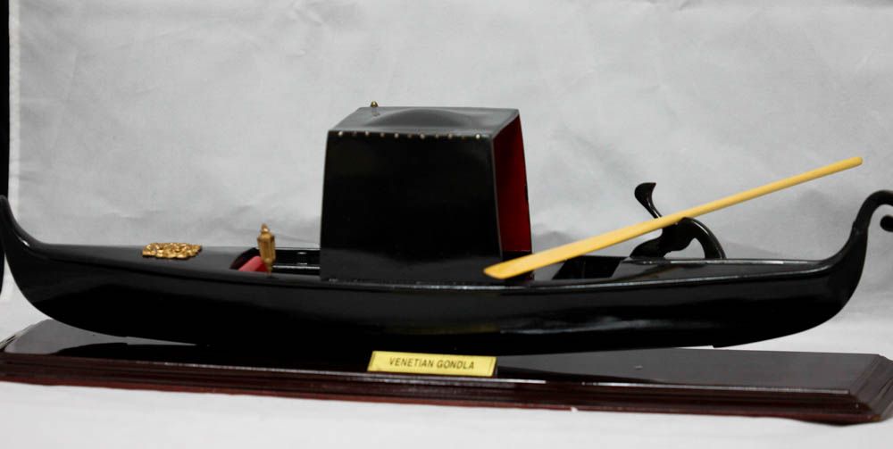 COLLECTORS EDITION 17TH CENTURY HAND CRAFTED WOODEN VEN **|**|** The Venetian gondolas around the 17th century were commonly used for transportation around the Grand Canal in Venice. Today, they are used as an iconic boat for mostly tourism. It is available as a FULLY ASSEMBLED model ready to be proudly display as a piece of history. Master craftsmen handcraft these highly detailed wood models from scratch using historical photographs, drawings and original plan. They are built to scale with high-grade wood such as: western red cedar, rosewood, and mahogany. They are 100% hand built individually using plank-on-frame construction method and are similar to the building of actual ships. Each model requires many hours to finish and must go through a demanding quality control process before leaving the workshop. The hull is beautifully painted in black and then varnished in several layers. The deck is decorated with several golden sculpture. Seating are and stern deck are painted in red. It has a gold plated ornament at the bow. The model comes with one black painted oar. A hand stitched pillow casing is tied up against the cockpit on the opposite of the red wooden seat. There is a wooden platform for the gondolier to stand on. This model also come with a wood base with a brass nameplate. It ; MSRP: $0