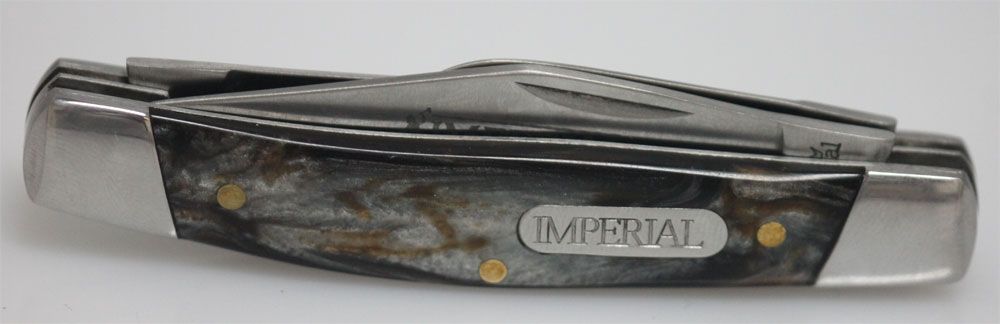 COLLECTORS EDITION 3 3/8" IMPERIAL SCHRADE STOCKMAN KNI **|**|** Imperial Schrade Medium Stockman. 3 3/8" closed. Stainless clip, spey and sheepsfoot blades. Red and brown swirl celluloid handles with nickel silver bolsters and Imperial inlay shield. ; MSRP: $0