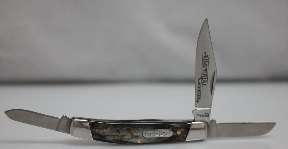 COLLECTORS EDITION 3 3/8" IMPERIAL SCHRADE STOCKMAN KNI **|**|** Imperial Schrade Medium Stockman. 3 3/8" closed. Stainless clip, spey and sheepsfoot blades. Red and brown swirl celluloid handles with nickel silver bolsters and Imperial inlay shield. ; MSRP: $0