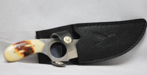 COLLECTORS EDITION 5.5" BONE HANDLE SHORT SKINNER STAIN **|**|** 3.5" BLADE; 2.5" HANDLE; STAINLESS STEEL BLADE BONE HANDLE WITH TOP GRAIN LEATHER SHEATH ; MSRP: $0