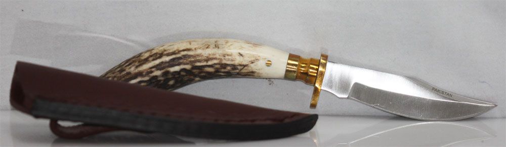 COLLECTORS EDITION 7.5" STEEL STAG HUNTING KNIFE **|**|** 7.5" STEEL STAG HUNTING KNIFE. Genuine stag handle. Brass guard. Includes leather sheath. ; MSRP: $0