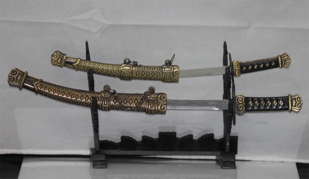 COLLECTORS EDITION 8" AND 10" SAMURAI SABRE SWORD LETTE **|**|** 8" AND 10" SWORD LETTER OPENERS WITH BLACK STAND COLLECTIBLE SET JAPANESE SAMURAI SABRE SWORDS WITH SHEATH STAINLESS STEEL ; MSRP: $0