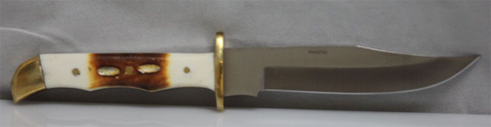 COLLECTORS EDITION 9.5" OLE SMOKEY SKINNER KNIFE FINGER **|**|** Ole Smoky Snake River Skinner. 9 1/2" overall. 5" stainless blade. Finger groove hardwood handle with brass guard and pommel. Brown leather belt sheath with fringe. ; MSRP: $0