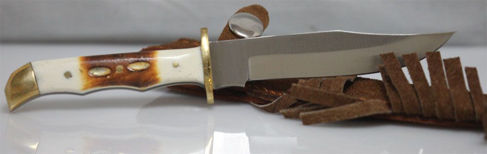 COLLECTORS EDITION 9.5" OLE SMOKEY SKINNER KNIFE FINGER **|**|** Ole Smoky Snake River Skinner. 9 1/2" overall. 5" stainless blade. Finger groove hardwood handle with brass guard and pommel. Brown leather belt sheath with fringe. ; MSRP: $0