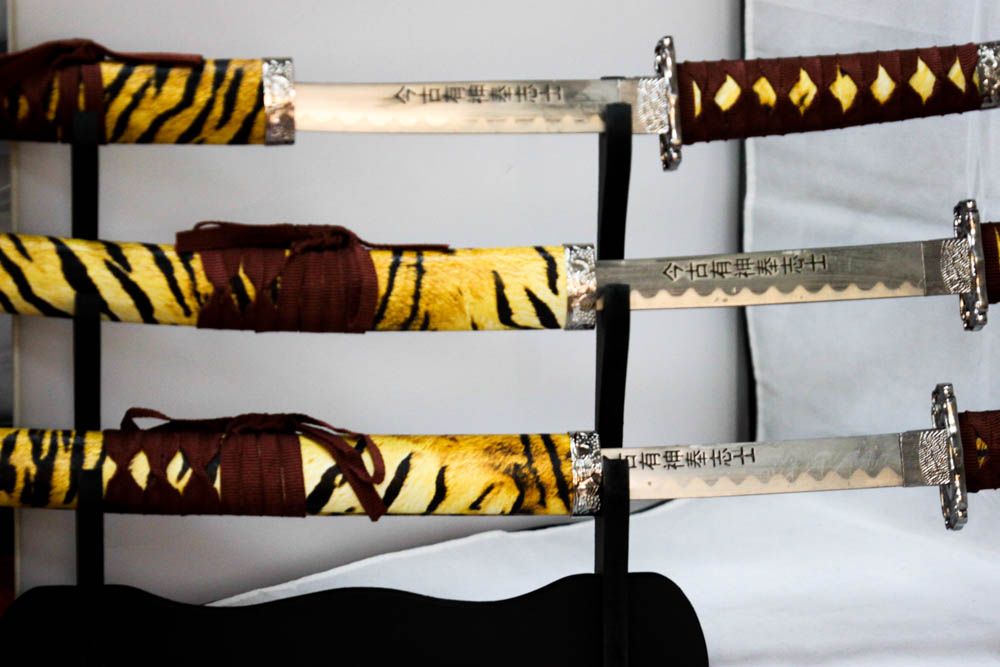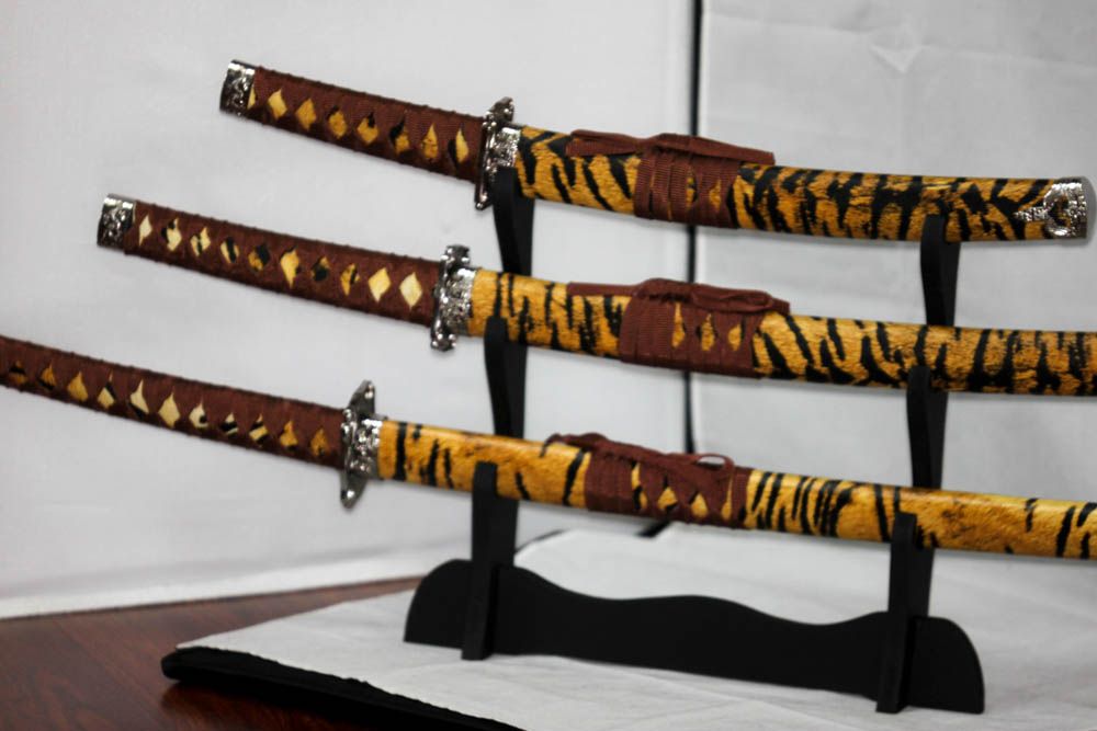 COLLECTORS EDITION CHEETAH PRINT SAMURAI KATANA SWORDS **|**|** COLLECTORS EDITION CHEETAH PRINT SAMURAI KATANA SWORD SET WITH STAND ; MSRP: $0