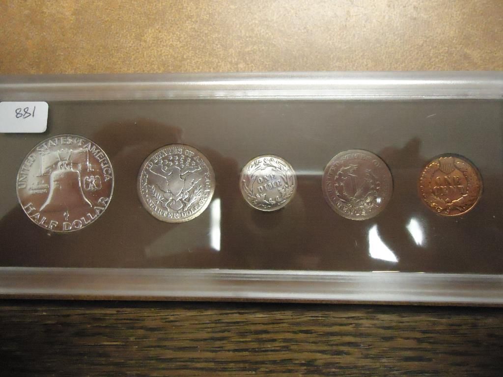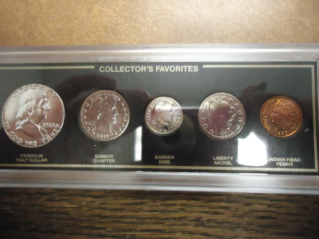 1907 INDIAN HEAD CENT, 191O LIBERTY "V" NICKEL, 1916 BARBER DIME, 1916-D BARBER QUARTER AND 1963 FRANKLIN HALF DOLLAR
