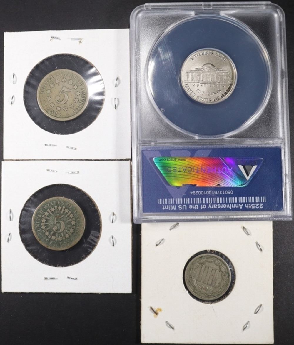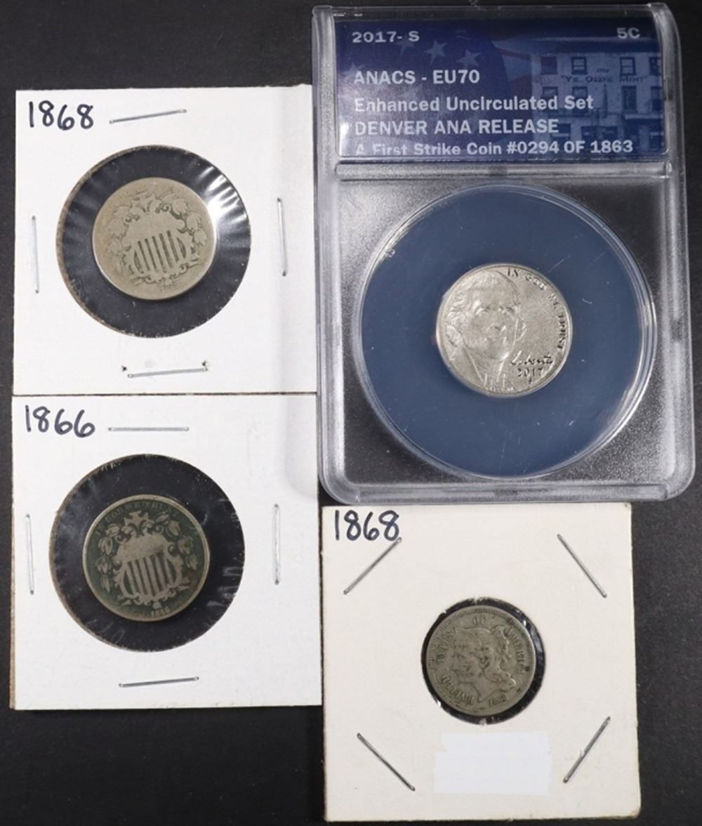 1868 3-CENT NICKEL FINE, 1866 SHIELD NICKEL WITH RAYS VG, 1868 SHIELD NICKEL AG, 2017-S JEFFERSON NICKEL ANACS EU70 (ENHANCED UNCIRCULATED SET, DENVER ANA RELEASE, A FIRST STRIKE COIN) ESTIMATE $75 - $100.