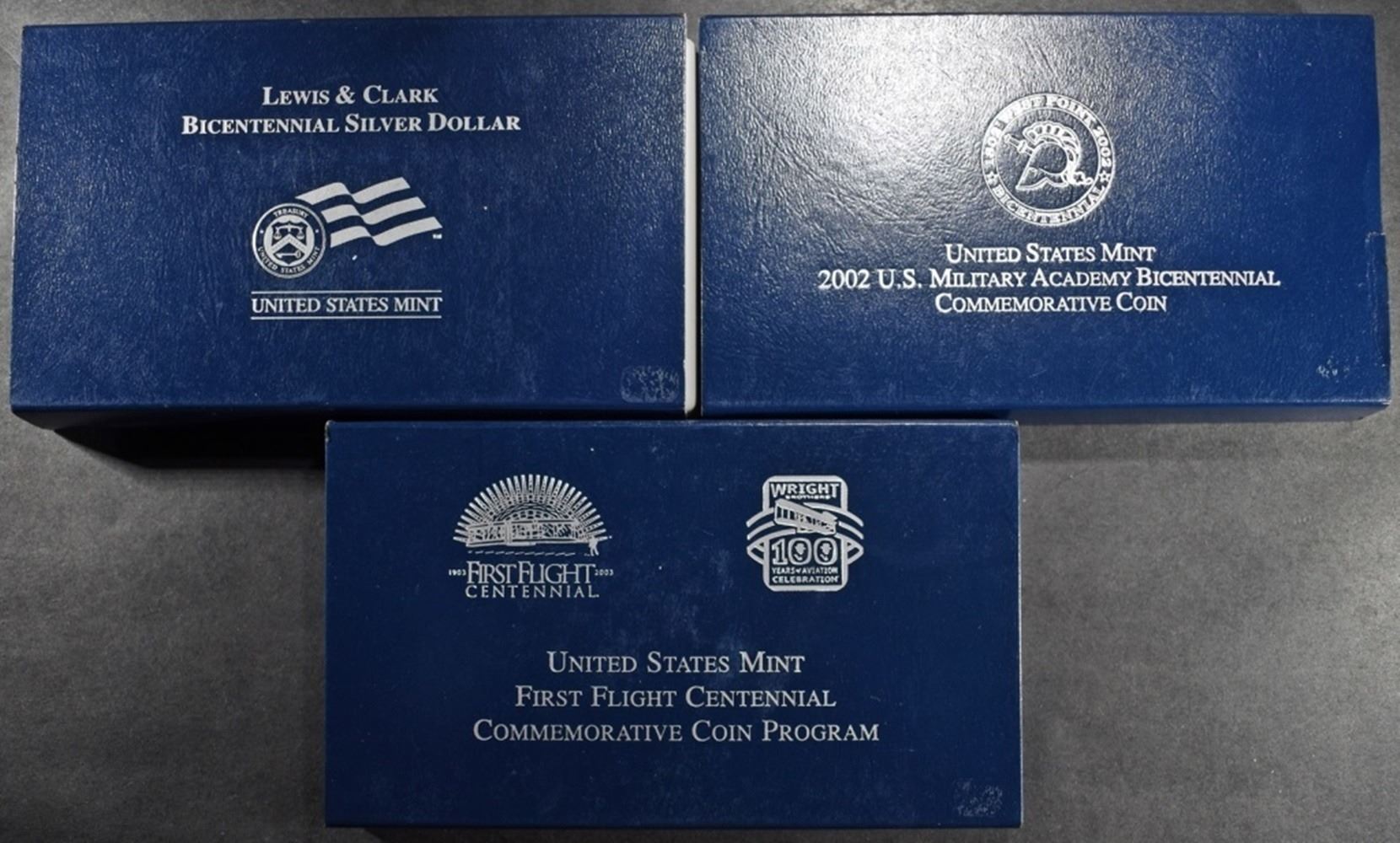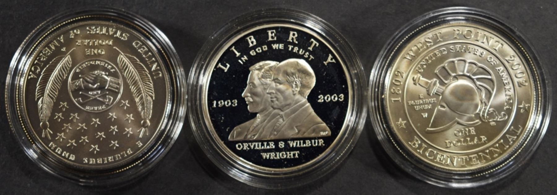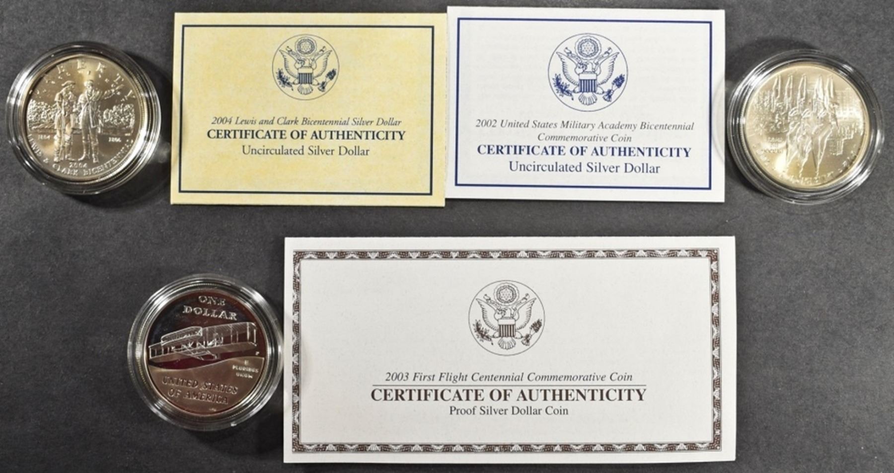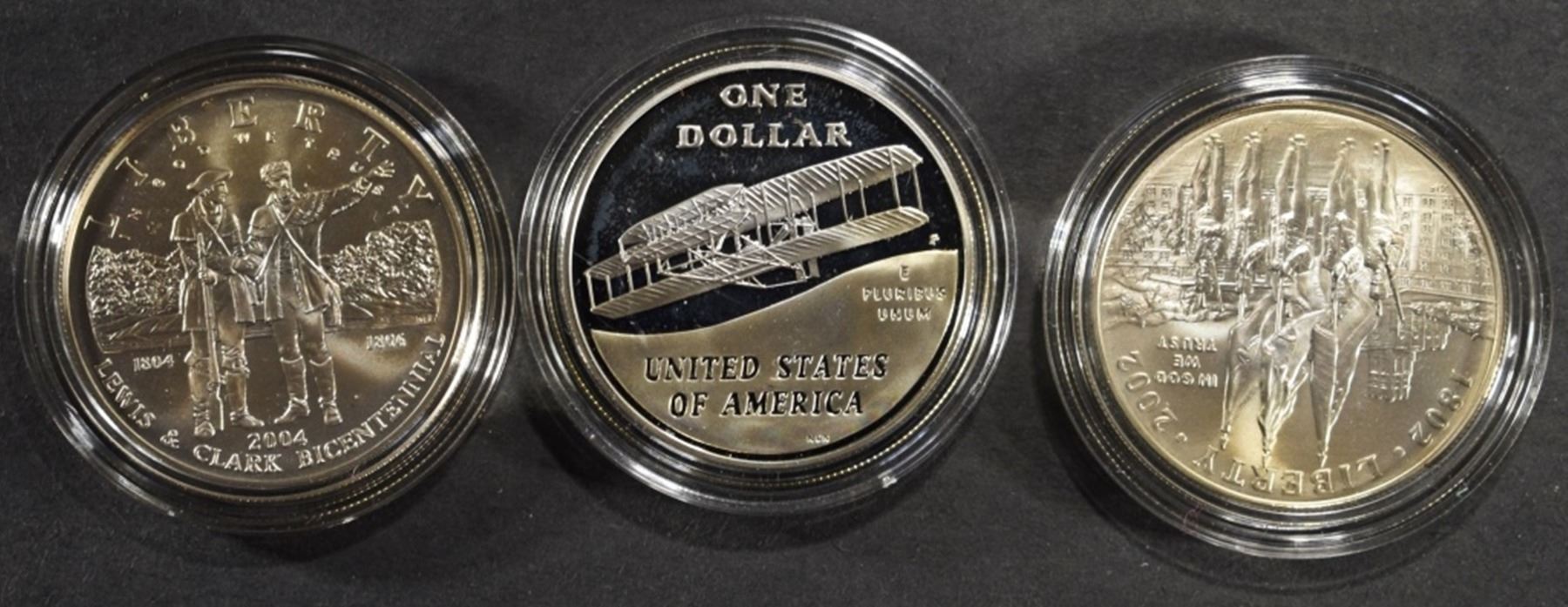 2002-W WEST POINT COMM UNC SILVER DOLLAR OGP, 2004-P LEWIS & CLARK COMM UNC SILVER DOLLAR OGP, 2003-P FIRST FLIGHT COMM PR SILVER DOLLAR OGP ESTIMATE $110 - $160.