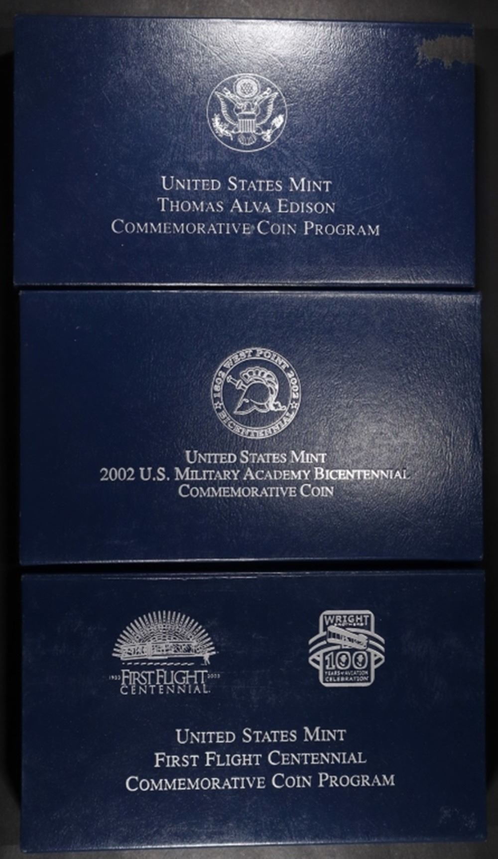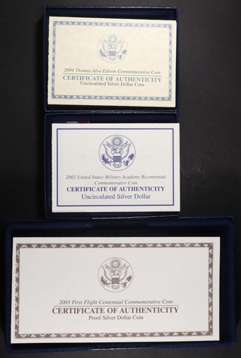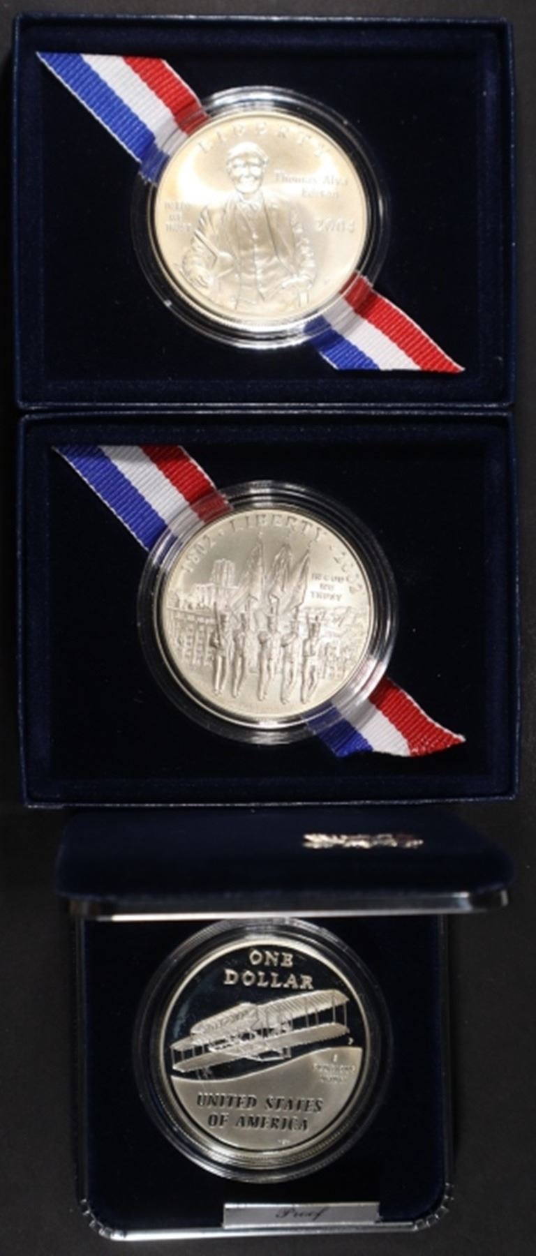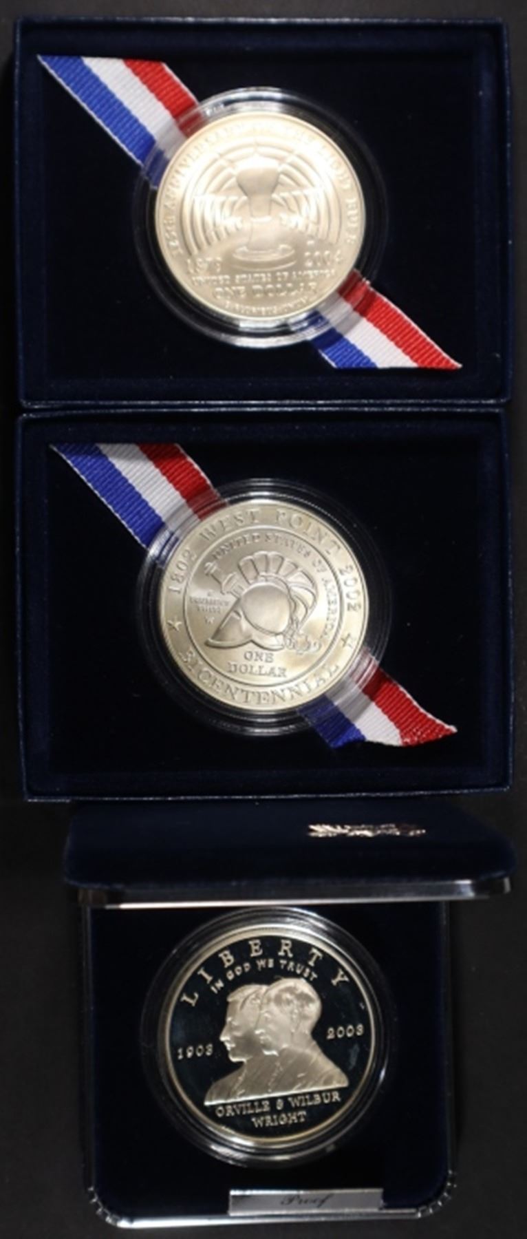 2002-W WEST POINT COMM UNC SILVER DOLLAR OGP, 2004-P THOMAS EDISON COMM UNC SILVER DOLLAR OGP, 2003-P FIRST FLIGHT COMM PR SILVER DOLLAR OGP ESTIMATE $110 - $150.