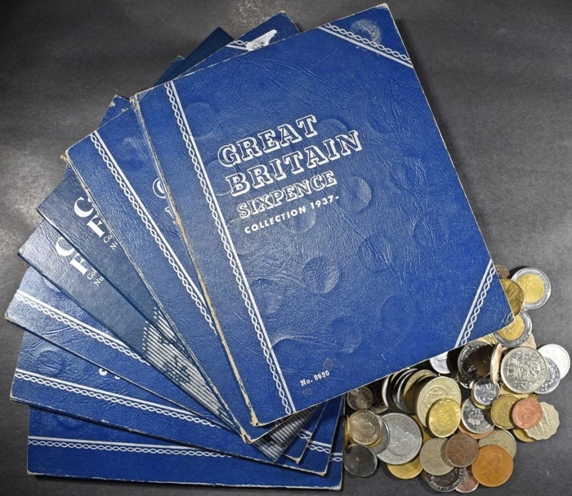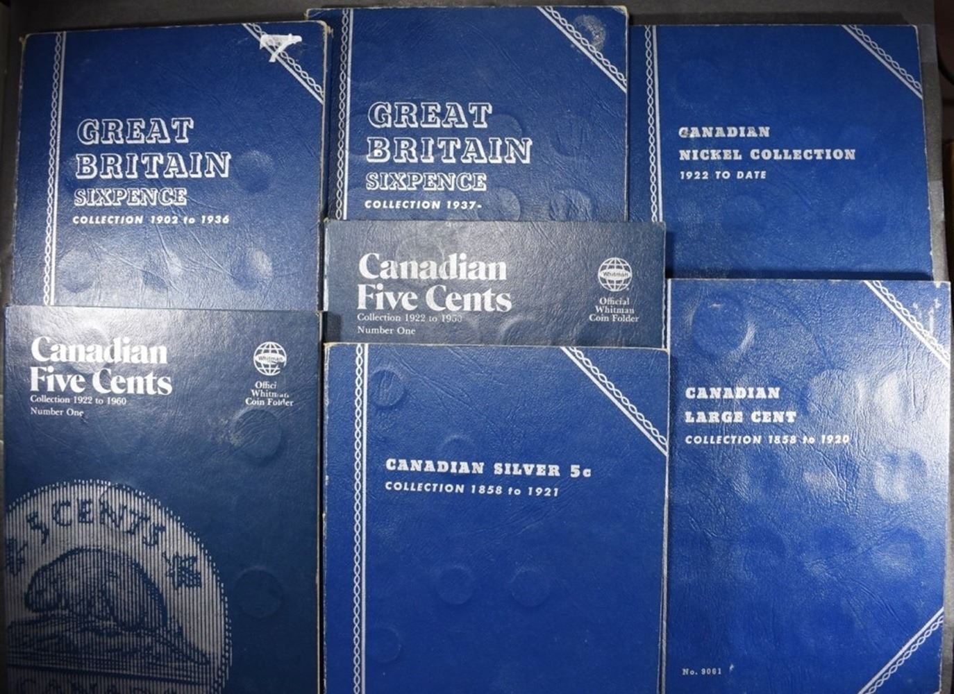 2.9 lbs MIXED FOREIGN COINS, (2) PARTIAL BLUE WHITMAN GREAT BRITIAN COIN ALBUM SETS, (5) PARTIAL BLUE WHITMAN CANADIAN COIN ALBUM SETS ESTIMATE $110 - $160.