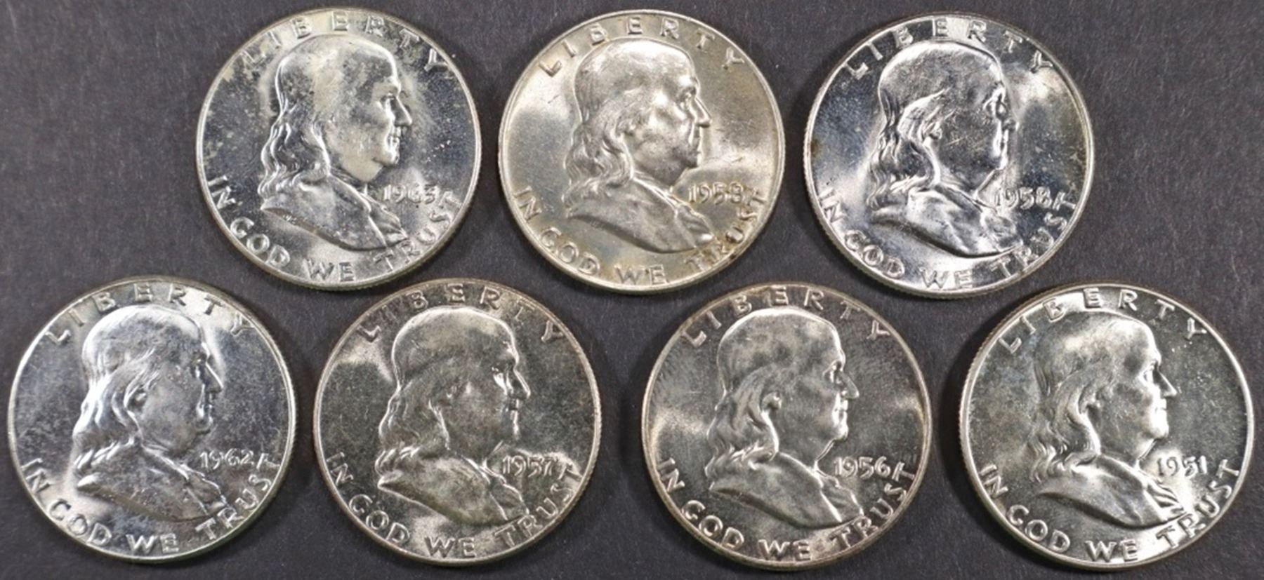 1951, 1956, 1957, 1958, 1958-D, 1962, 1963-D FRANKLIN HALF DOLLARS BU ESTIMATE $90 - $130.