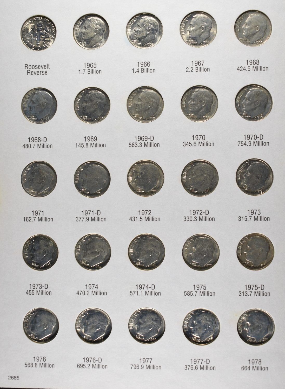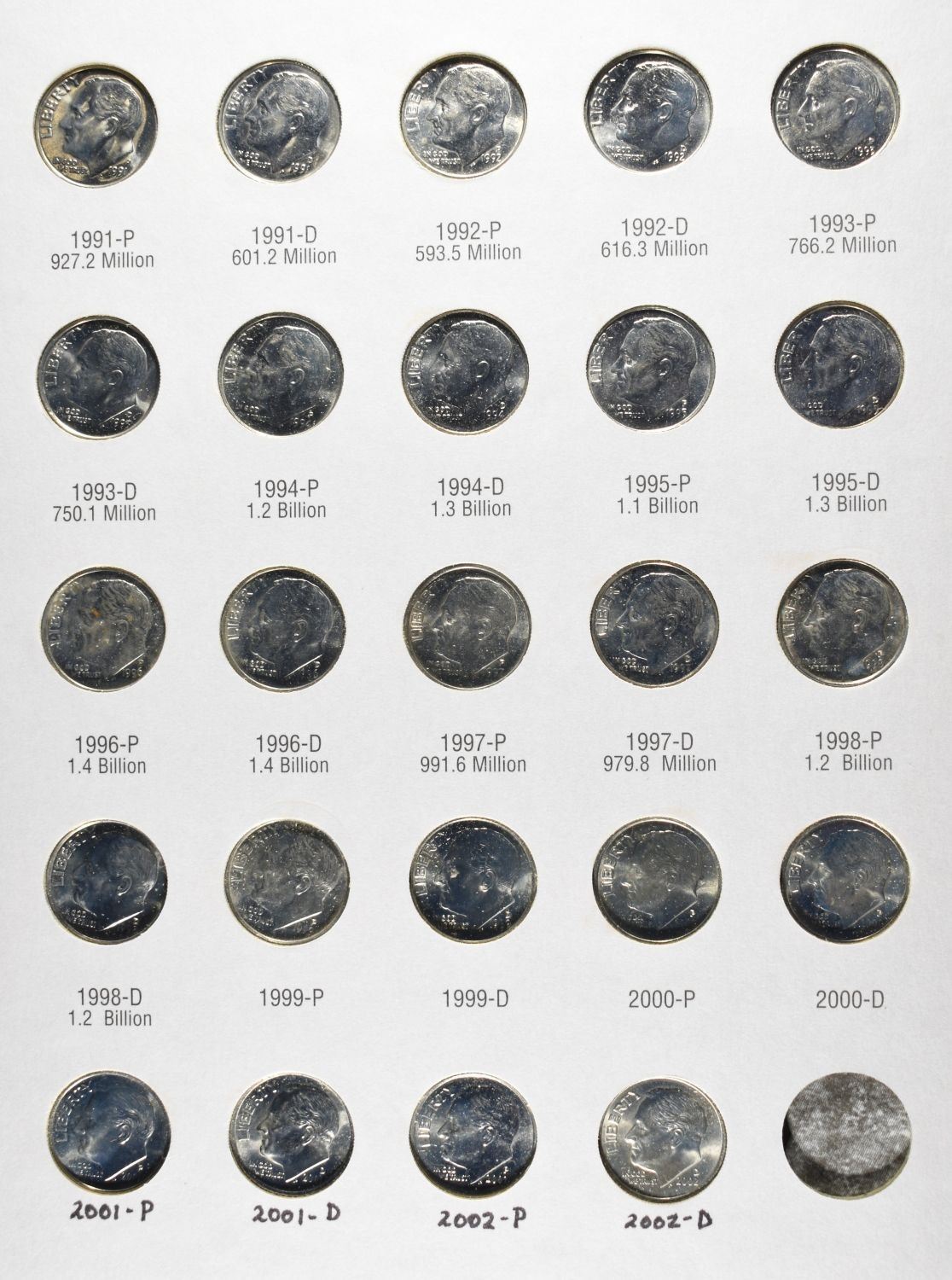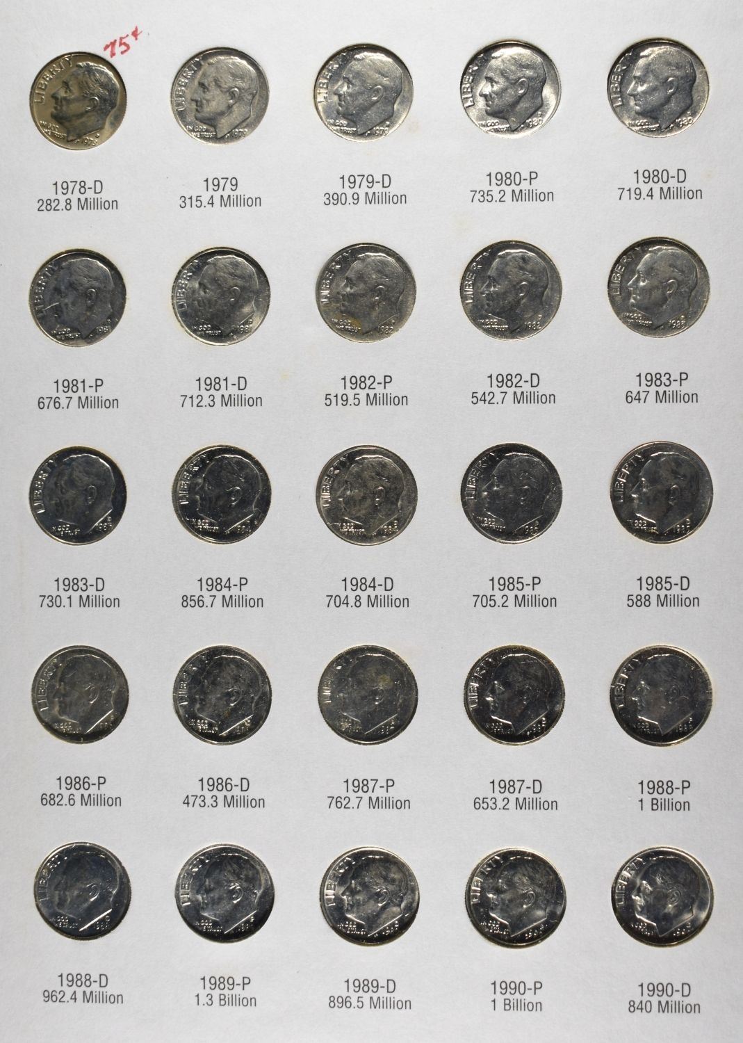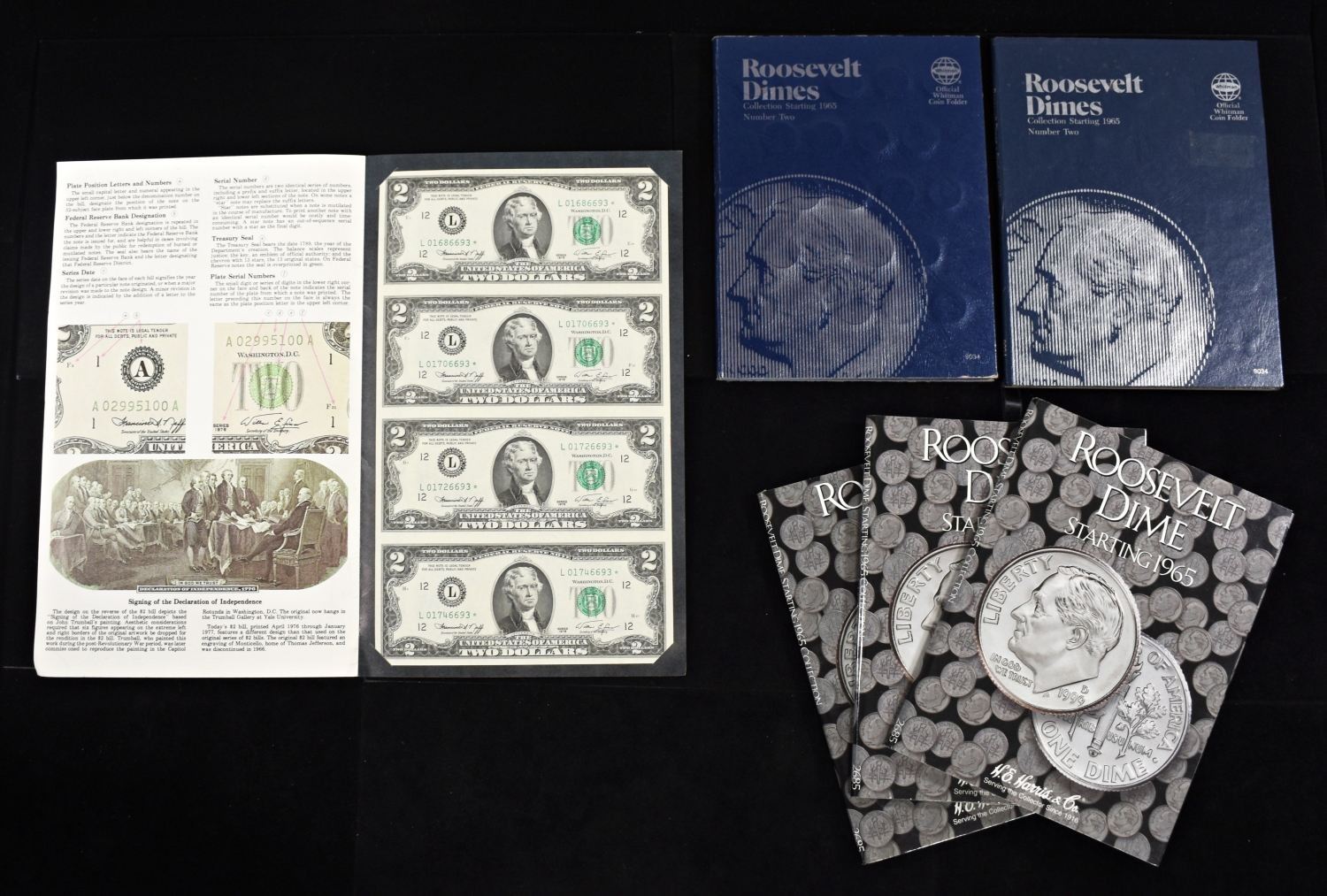 (3) H.E. HARRIS&CO ROOSEVELT DIME COMEPLETE ALBUMS, (2) WHITMAN ROOSEVELT DIMES ALBUM, (4) 2 DOLLAR BILLS UNCUT ESTIMATE $75 - $100.
