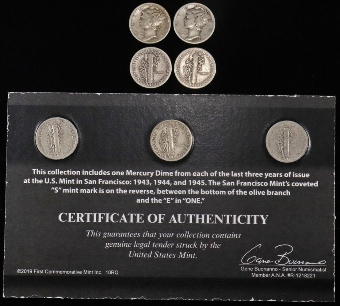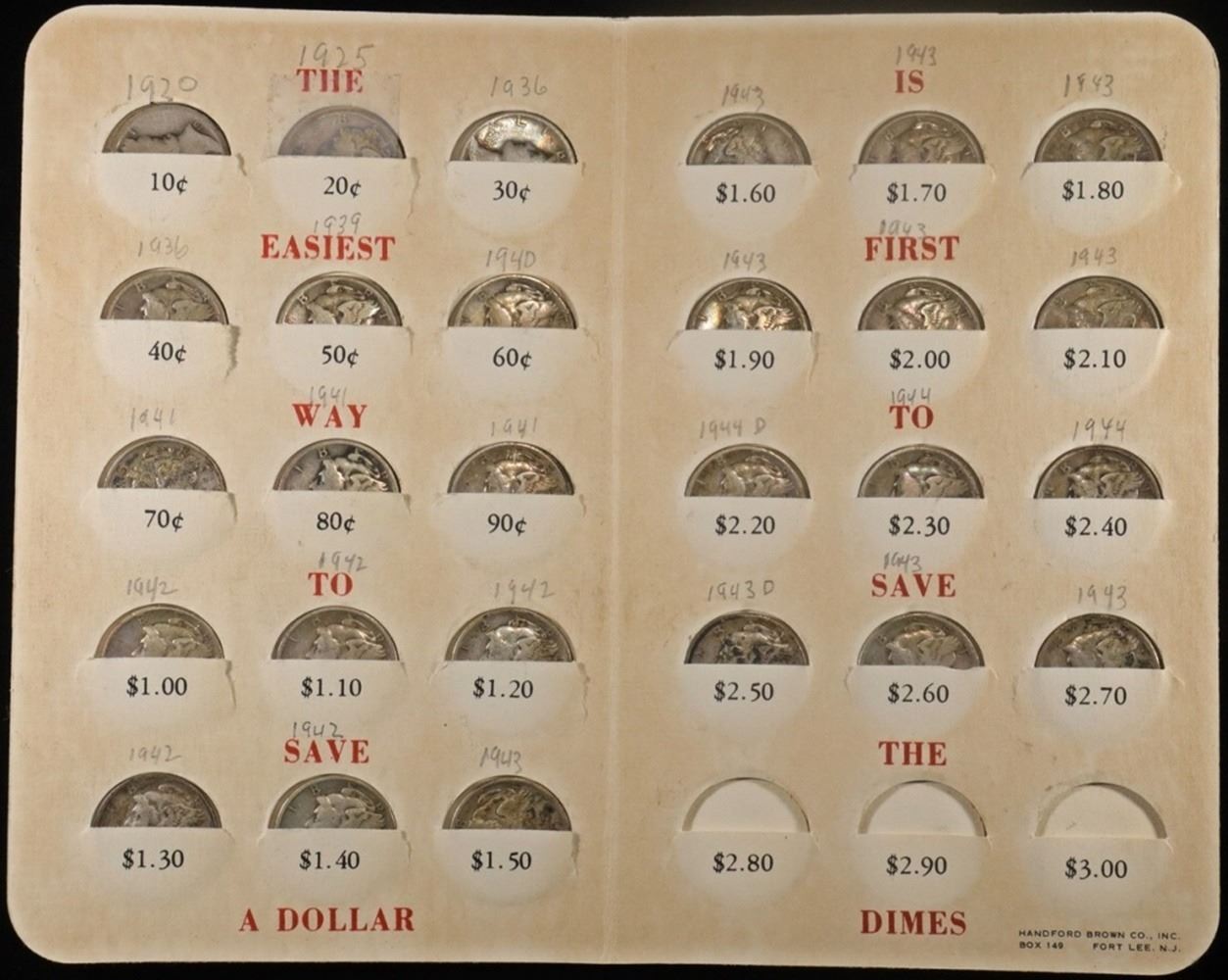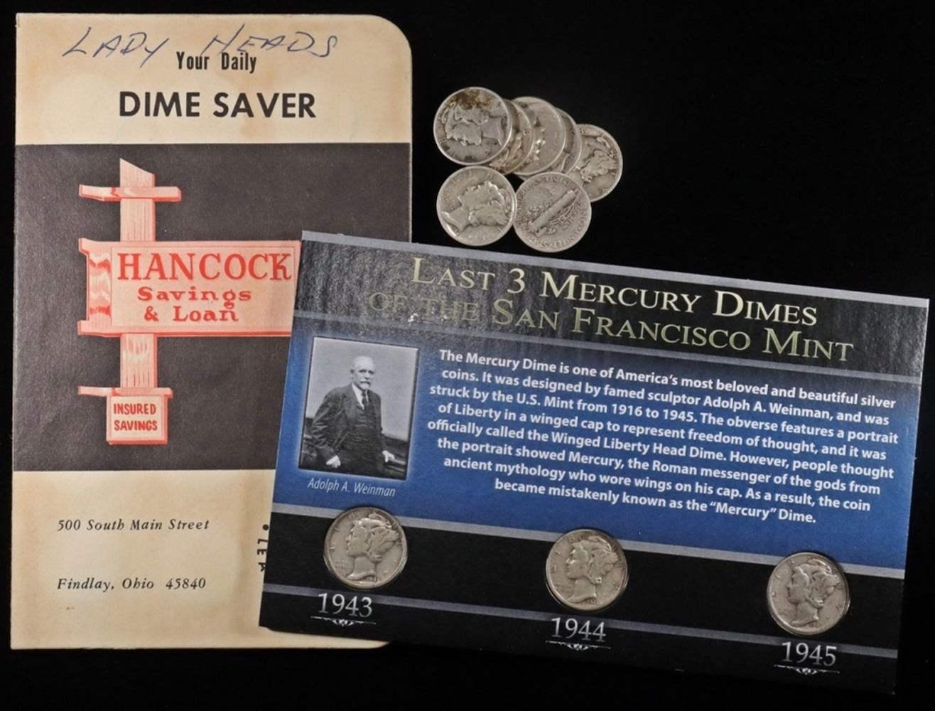 (1) HANCOCK COUNTY SAVINGS & LOAN DAILY DIME SAVER INCLUDES 27 MERCURY DIMES, (1) LAST MERCURY DIMES OF THE SAN FRANCISCO MINT 3-COIN SET, (7) MIXED DATES MERCURY DIMES ESTIMATE $120 - $170.