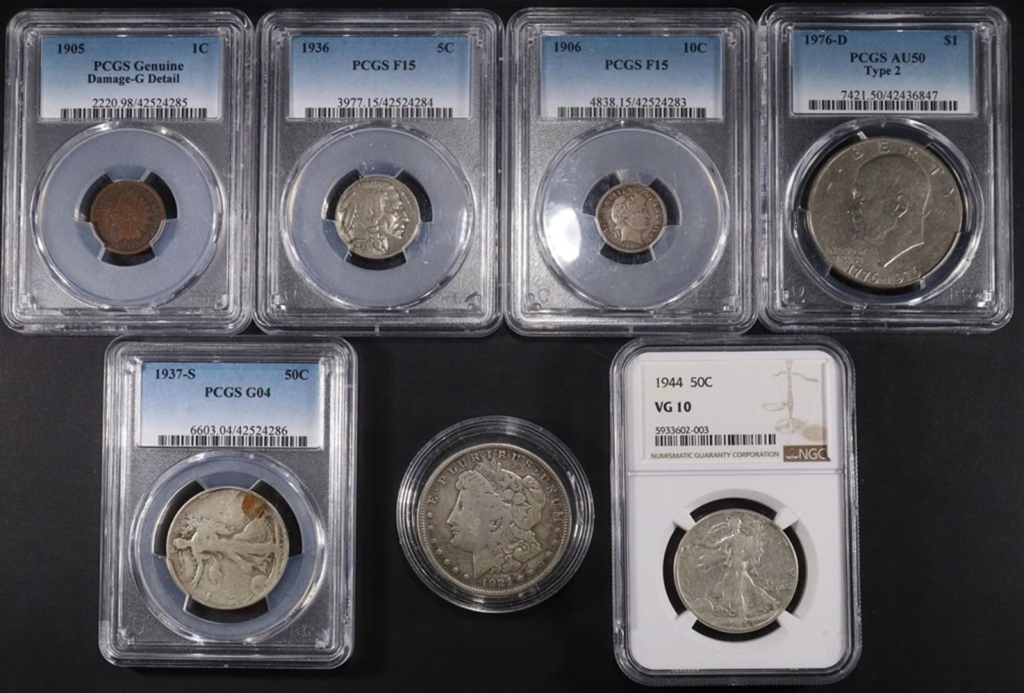 1905 INDIAN CENT PCGS GENUINE DAMAGE-G DETAIL, 1936 BUFFALO NICKEL PCGS F15, 1906 BARBER DIME PCGS F15, 1937-S WALKING LIBERTY HALF DOLLAR PCGS G04, 1944 WALKING LIBERTY HALF DOLLAR NGC VG 10, 1976-D T-2 EISENHOWER