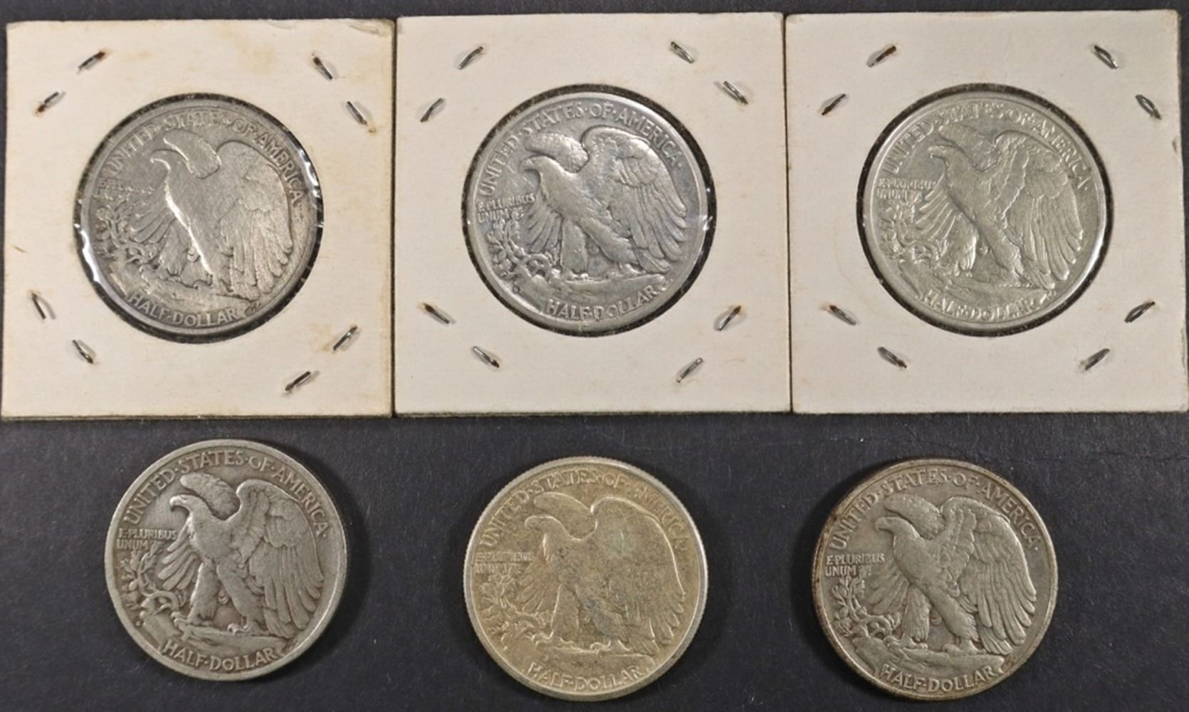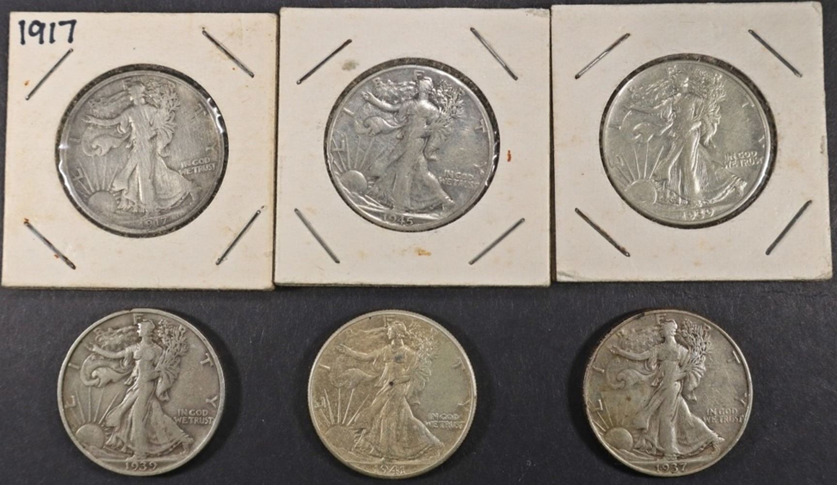 1917 VG, 1937 XF, 1939 XF, 1939-S FINE, 1941 AU, 1945-S VG WALKING LIBERTY HALF DOLLAR VG ESTIMATE $80 - $120.