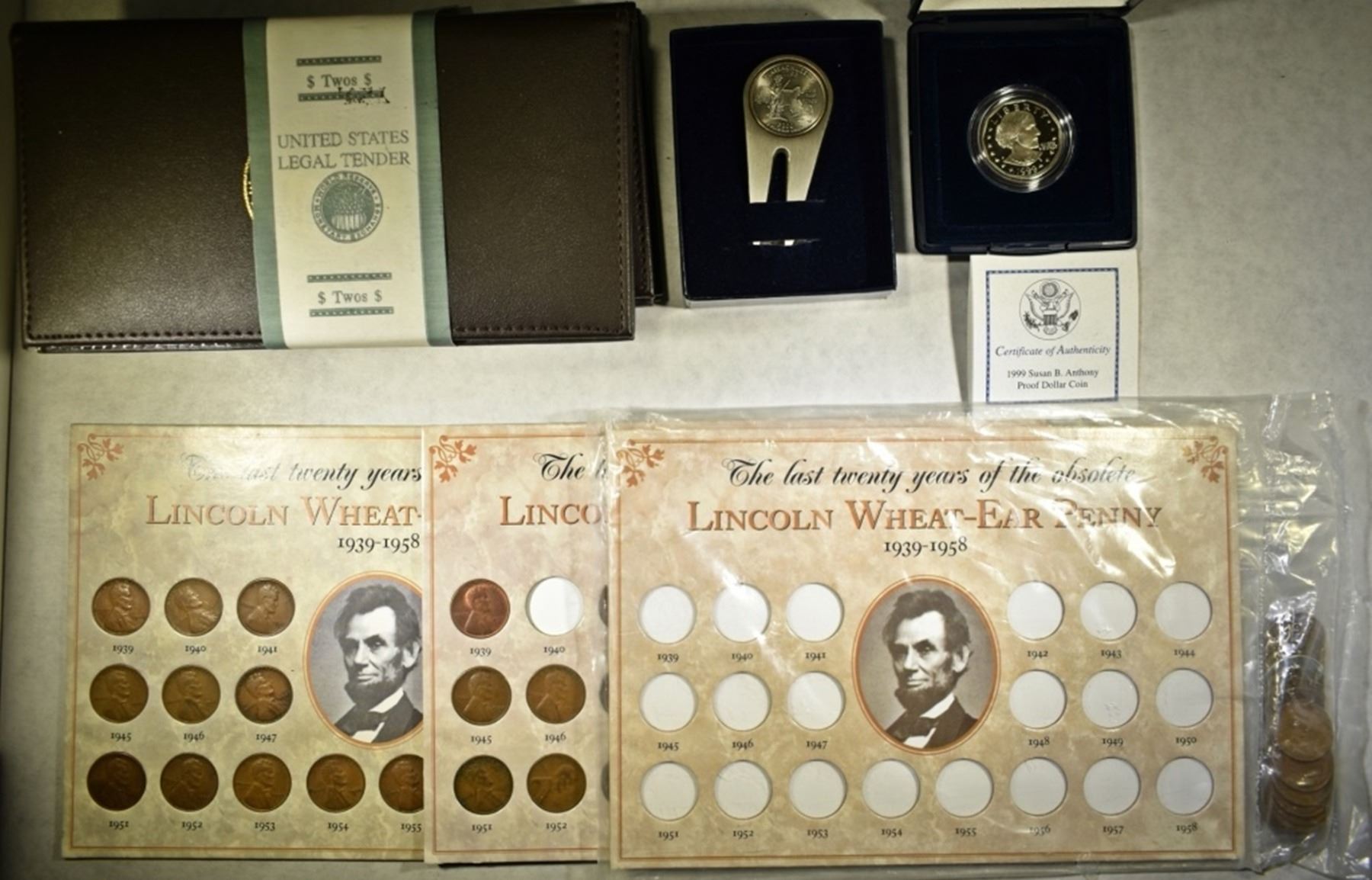 1999 PROOF SBA IN OGP, 2000 MASSACHUSETTS  GOLF DIVIT TOOL, 4 2003 $2 FROM WORLD RESERVE  MONETARY EXCHANGE AND 3 LINCOLN CENT BOARDS.    ESTIMATE $60 - $80.