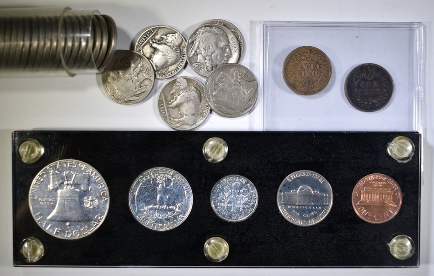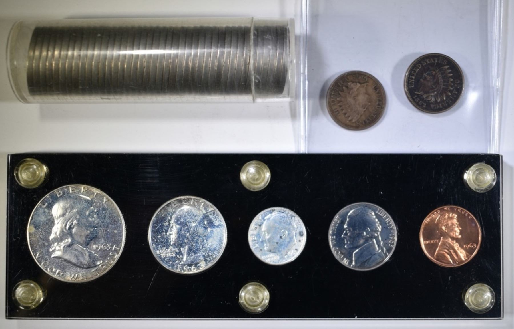 1963 PROOF SET, ROLL MIXED DATE BUFFALO NICKELS & 2-1862 INDIAN CENTS (XF & F). ESTIMATE $90 - $110.
