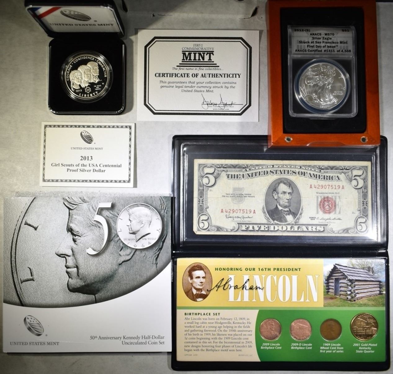 2012-S AMERICAN SILVER EAGLE ANACS MS-70, 2013 GIRL SCOUT SILVER PROOF COMMEM, 2014 50TH ANNIV KENNEDY HALF DOLLAR & LINCOLN BIRTHPLACE SET. ESTIMATE $110 - $130.
