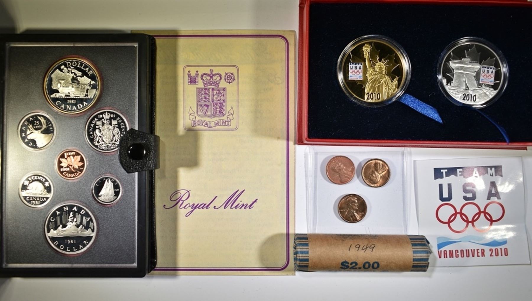 1934, 1943 & 1970-S LINCOLN CENTS, ROLL OF CIRC 1949-P,D,S & 1959-P,D JEFFERSON NICKELS, 1981 DOUBLE DOLLAR CANADIAN PROOF SET & VANCOUVER 2010 TEAM USA 2-COIN SET. ESTIMATE $80 - $100.