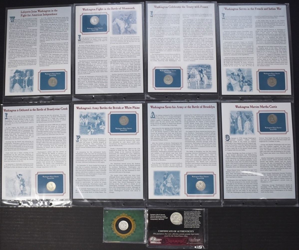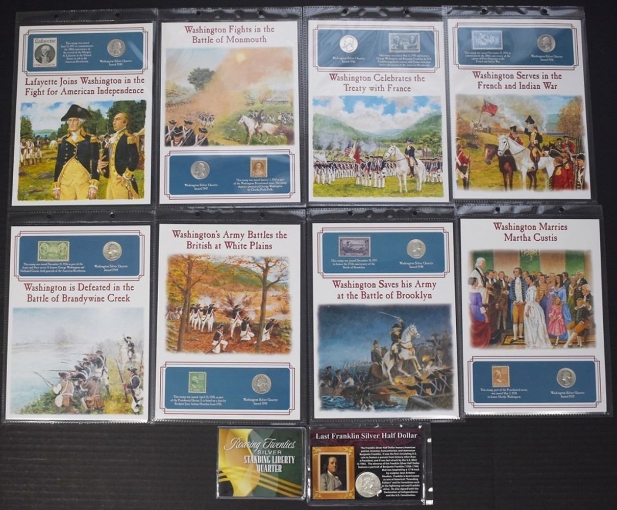 1929 STANDING LIBERTY QUARTER, 1963 FRANKLIN HALF DOLLAR, (8) STAMPS & SILVER WASHINGTON QUARTER SHEETS ESTIMATE $80 - $120.