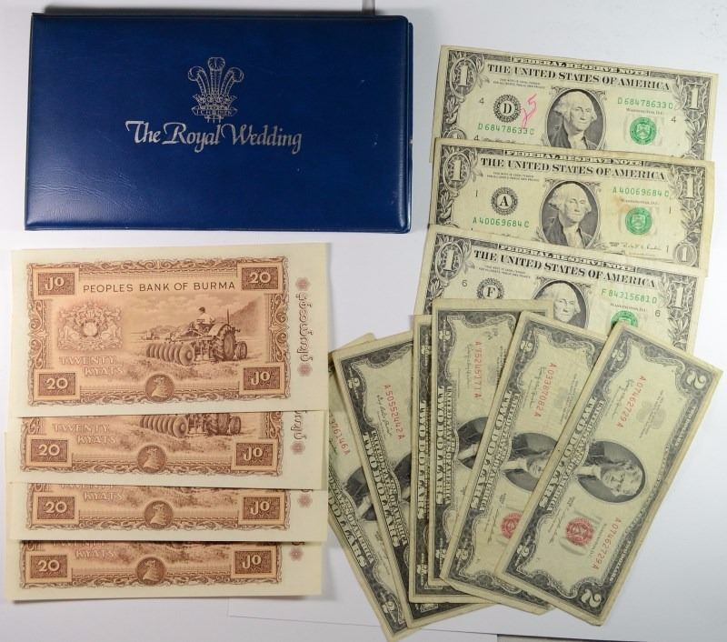 6 $2 RED SEAL NOTES, 3 1995 $1 WEB NOTES, 4 BURMA 20 KYOTO UNCIRCULATED CONSECUTIVE SERIAL NUMBERS (PINHOLES IN LEFT EDGE), & 1981 ROYAL WEDDING FIRST DAY COVER. ESTIMATE $50 - $60.