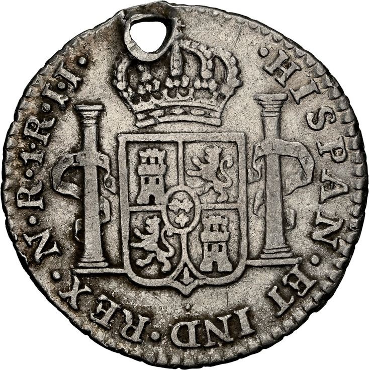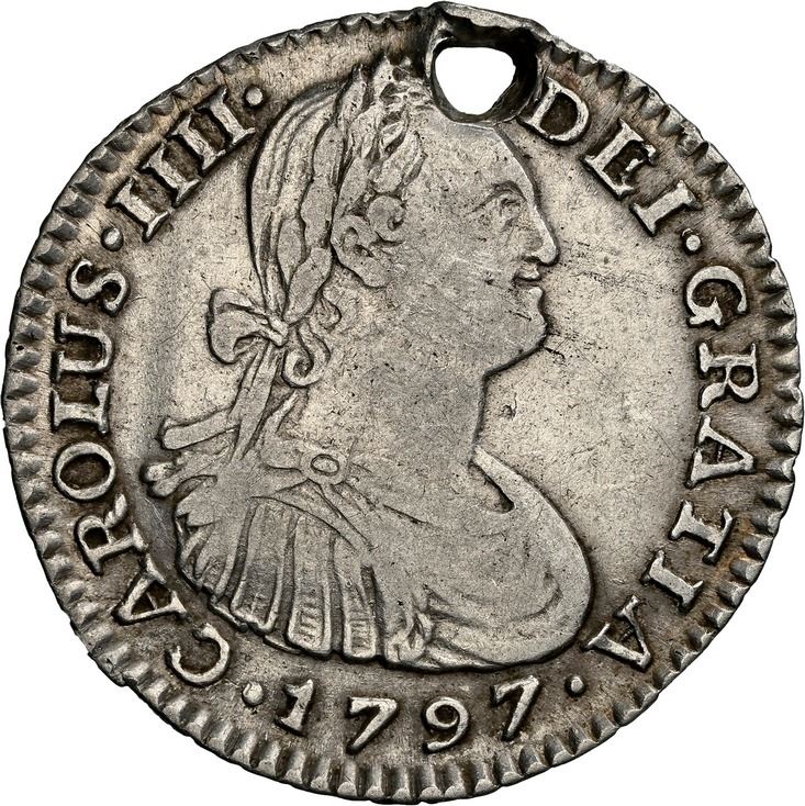 COLOMBIA, Bogotá, bust 1 real, Charles IV, 1797 JJ, NGC VF details / holed, ex-Becerra. Restrepo-78.20; KM-58; Cal-493. Crudely holed at the top yet with sharp, high-VF details. Pedigreed to the Becerra Collection (stated on label).
