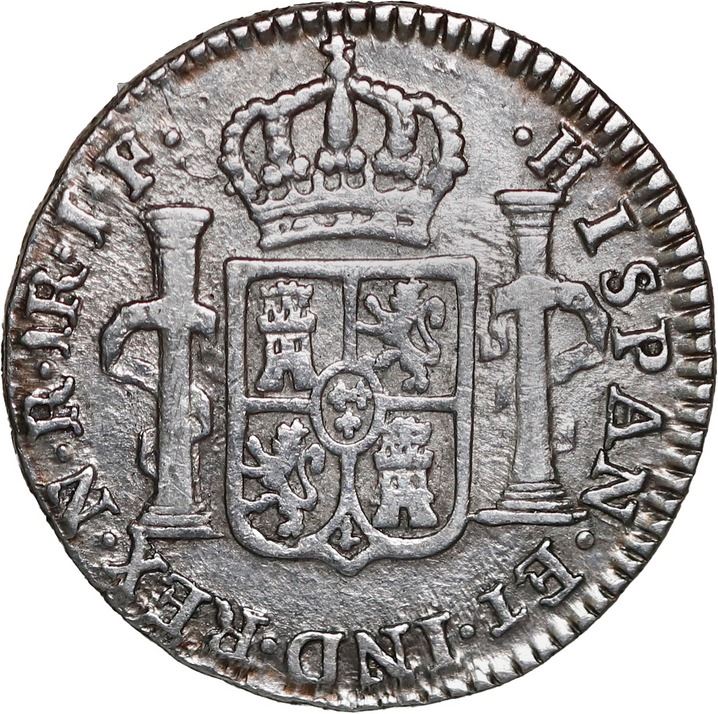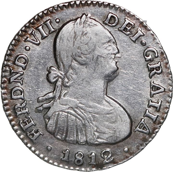 COLOMBIA, Bogotá, bust 1 real, Ferdinand VII (bust of Charles IV), 1812 JF, ex-Becerra. Restrepo-111.5; KM-68.1; Cal-652. 3.03 grams. Bold AXF with lustrous, lightly cleaned surfaces, slightly doubled bust. Pedigreed to the Becerra Collection.