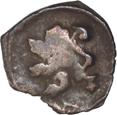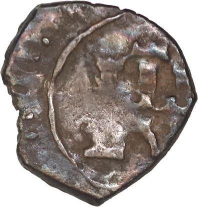 COLOMBIA, Bogotá, cob ¼ real, Philip IV, no assayer (1649-65), castle with tilted doorway / ball-tailed lion, ring-inside-dots borders. Restrepo-M14.1; KM-unl; Cal-531. 0.63 gram. XF with bold lion and castle (the latter off-center), deeply rainbow toned.