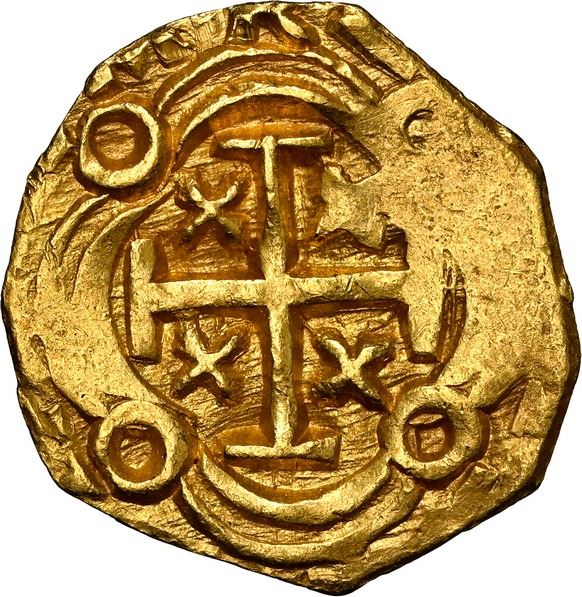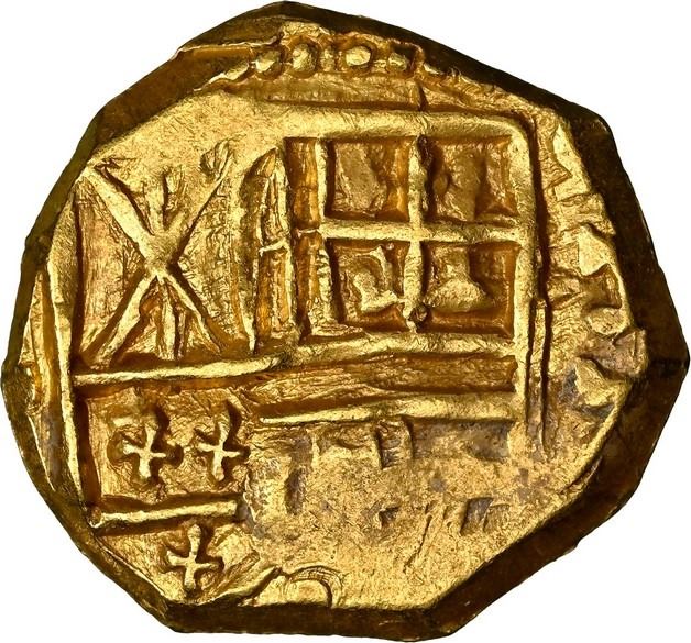 COLOMBIA, Bogotá, gold cob 1 escudo, (1693), assayer ARCE, rare, NGC MS 62 (1715 Fleet Shipwreck Label). Restrepo-M64.12; S-B24; Cal-836; Fr-5; KM-13. 3.39 grams. Choice full cross, nearly full shield with lots of details but flat at bottom right, with distinctive rendering of elements (Naples Sicily left without eagles, etc.) matching 2 escudos of 1693 (see Sedwick Auction 35 lot 92 for another example from same dies), lightly toned, technically second finest in NGC behind a single MS 63 of the same type listed under a slightly different date range. From the 1715 Fleet, with photo-certificate.