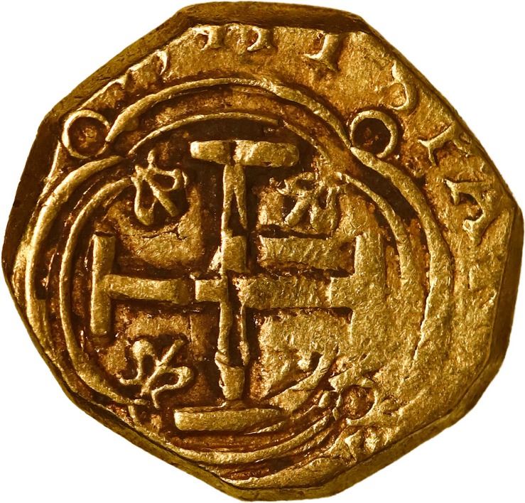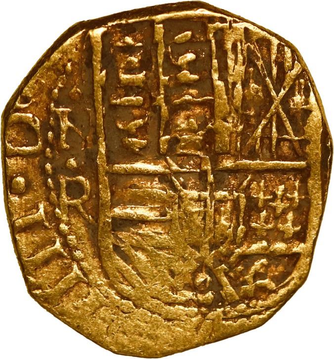 COLOMBIA, Bogotá, gold cob 2 escudos, 1645, assayer not visible (R) to right, mintmark NR to left, rare. Restrepo-M50.25; S-B21; KM-4.1; Cal-1803; Fr-2. 6.74 grams. AU with contrasting sediment in crevices, bottom tips of 45 of date visible outside of full cross-and-tressure, full •N•R and king's ordinal IIII to left of full shield, minor doubling throughout.