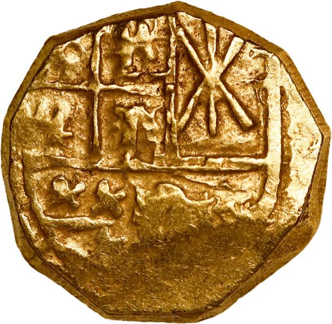 COLOMBIA, Bogotá, gold cob 2 escudos, (1704), no assayer (Arce). Restrepo-M66.32; S-B24; KM-14.2; Cal-1922 (under Ph. V); Fr-4a. 6.71 grams. Small, round-flan AU+ with distinctive shield lacking dots in Naples-Sicily (see previous lot, with which it shares the same reverse die) attributable to 1704 (date not visible), the cross full and bold but slightly off-center.
