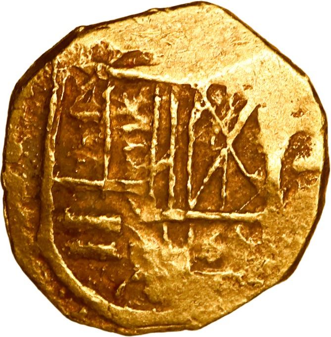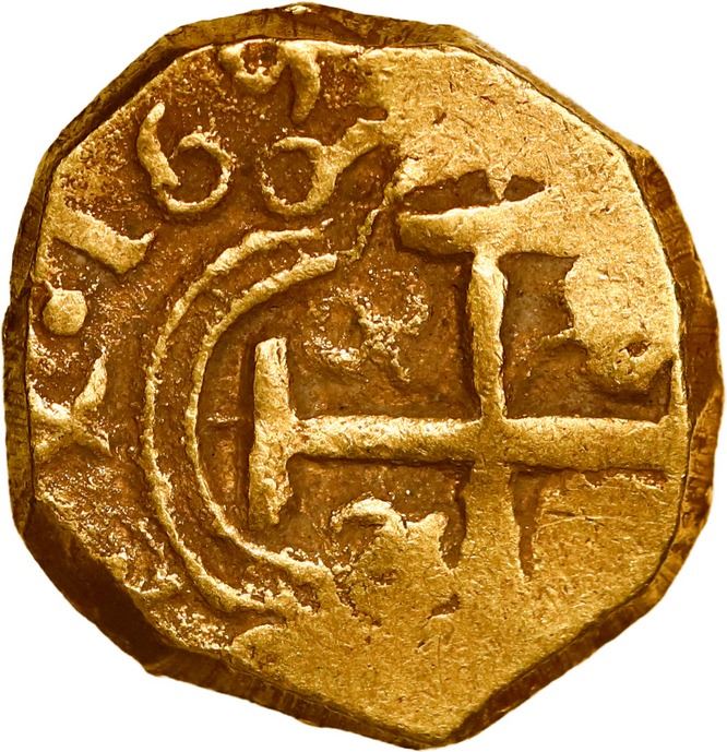 COLOMBIA, Bogotá, gold cob 2 escudos, Charles II, assayer not visible (G) below denomination II to right, mintmark NR to left, style of 1690-92. Restrepo-M66.12; S-B23; KM-14.1; Cal-Type 151; Fr-3. 6.81 grams. AU for grade but struck from crude old dies (rusty), with bold full 169 of date (but pre-Arce style) outside of bold but off-center cross, nicely centered full shield, sediment in crevices.