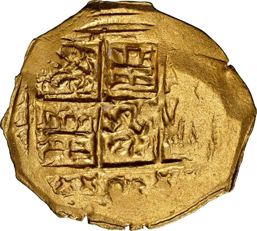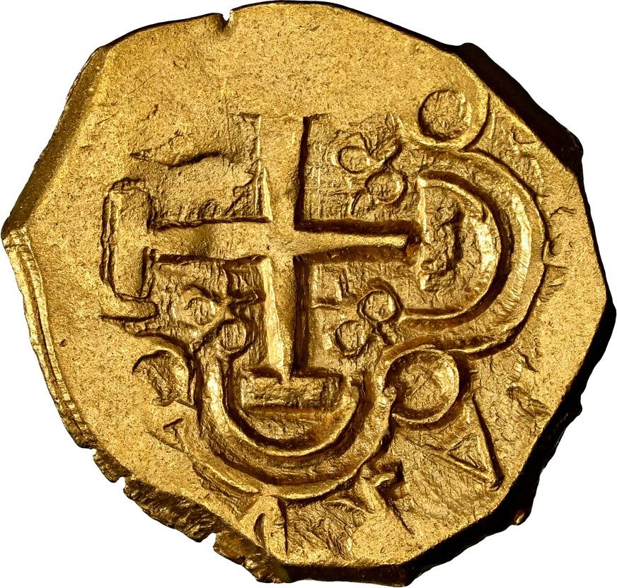COLOMBIA, Bogotá, gold cob 2 escudos, Charles II posthumous, no assayer (Arce), NGC MS 62 (1715 Fleet Shipwreck Label). Restrepo-M66.32; S-B24; Cal-Type 242 (under Ph. V); Fr-4a; KM-14.2. 6.80 grams. Broad flan with nearly full cross and shield (upright lions in transposed quadrants), good luster for the designated grade. From the 1715 Fleet.