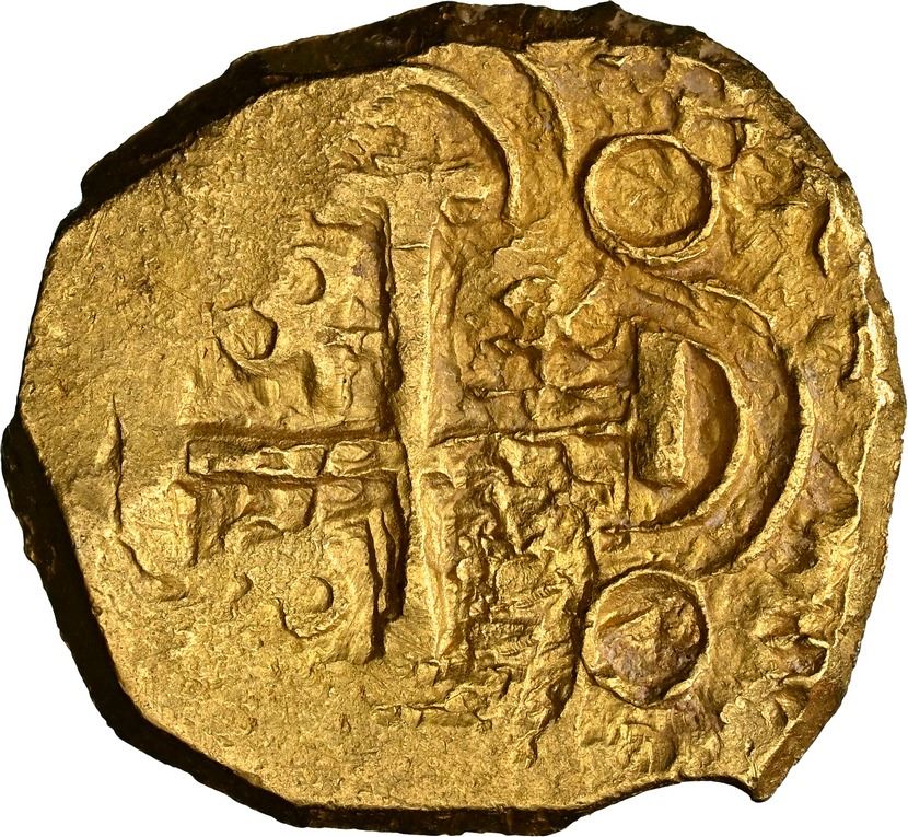 COLOMBIA, Bogotá, gold cob 2 escudos, Charles II posthumous, no assayer (Arce), NGC MS 63 (1715 Fleet Shipwreck Label). Restrepo-M66.32; S-B24; Cal-Type 242 (under Ph. V); Fr-4a; KM-14.2. 6.74 grams. Bold full cross (slightly doubled) and most of shield showing upright lions in transposed quadrants and coral encrustation in crevices, muted luster. From the 1715 Fleet.
