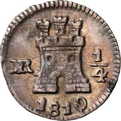 COLOMBIA, Bogotá, ¼ real, 1810/09, curved date, NGC XF details / environmental damage, ex-Becerra. Restrepo-100.5b; KM-67.1; Cal-287. Bold, quite lustrous piece with nice peach toning, light pitting on the castle. Pedigreed to the Becerra Collection (stated on label).