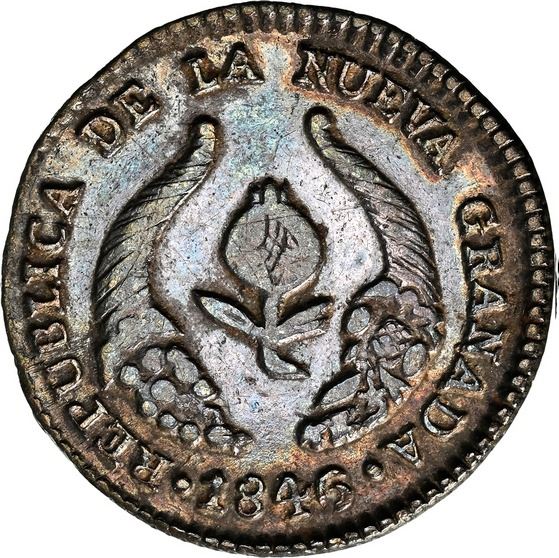 COLOMBIA, Bogotá, ½ real, 1846 RS, NGC XF 40, finest known in NGC census, ex-Toulemonde. Restrepo-177.15; KM-96.1. Very deeply rainbow-toned with bold details including rims (except for part of denomination side, which is slightly off-center), typical minor flan flaws. Pedigreed to the Gregorio Toulemonde Collection (stated on label).
