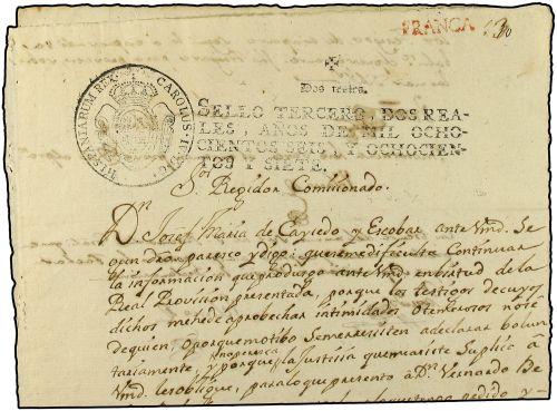 1807 (30-OCT) CALY. Documento sobre PAPEL SELLADO de 2 reales con marca FRANCA en rojo de CALY. MAGNIFICO y RARO.