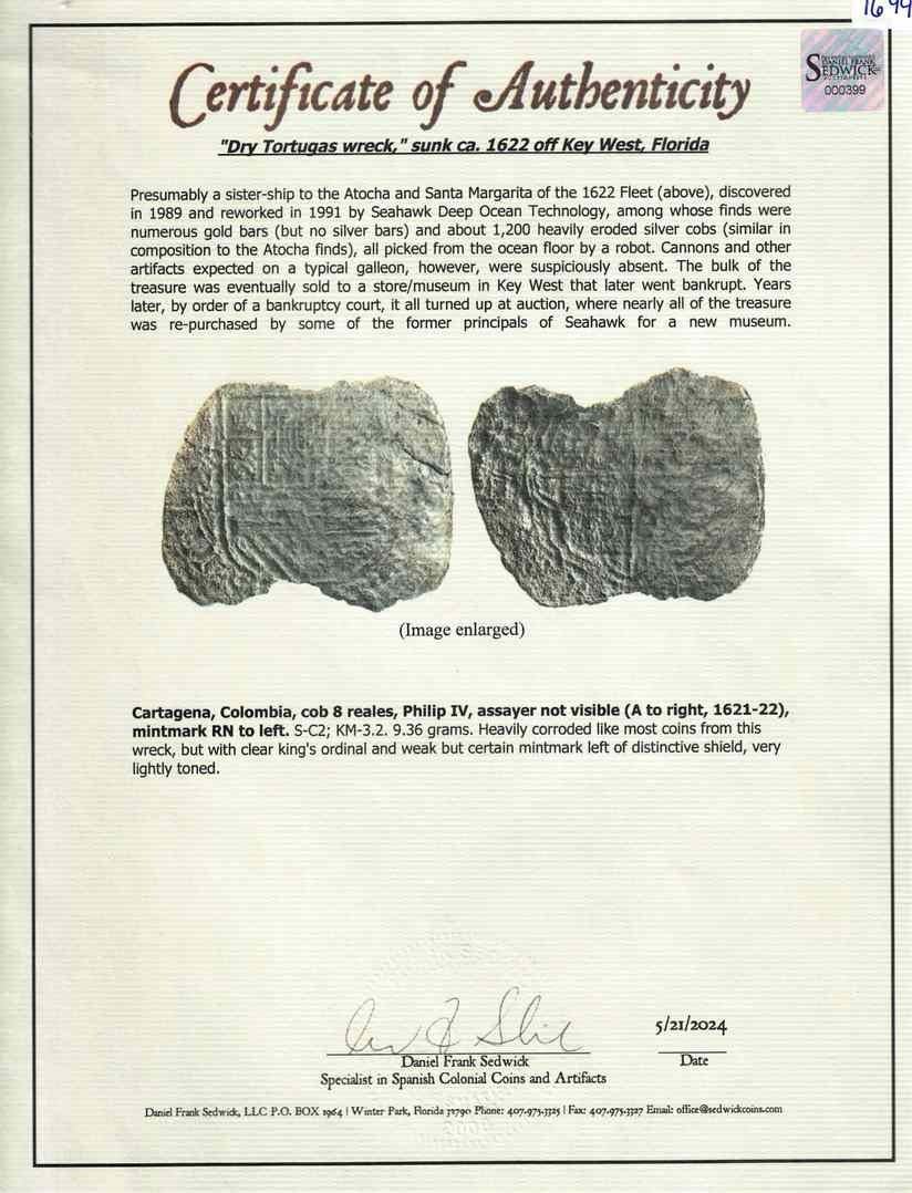 COLOMBIA, Cartagena, cob 8 reales, Philip IV, assayer not visible (A) to right, mintmark RN to left (1621-22), rare. Restrepo-M41.1; S-C2; KM-3.2; Cal-1533. 9.35 grams. Rare coin, especially from this wreck, corroded but with most of the shield and cross visible, full king's ordinal IIII in obverse legend. Pedigreed to Sedwick Auction 15, with original lot-tag 389 and photo-certificate. Recovered from: "Dry Tortugas Wreck," sunk ca. 1622 west of Key West, Florida