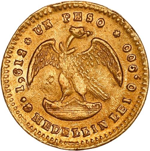 COLOMBIA, Medellín, gold 1 peso, 1872/1, condor reverse, ex-JEAS. Restrepo-324.1; Sed-unl (31 for type); Fr-unl (cf 108); KM-unl (157.1 for type). 1.60 grams. Problem-free AU with typically grainy surfaces from rusty dies, uncommon overdate (missing in Eldorado). Pedigreed to the JEAS Collection.